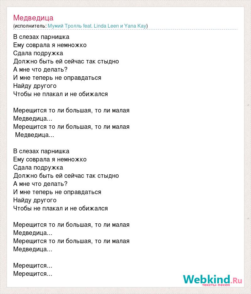 В слезах парнишка Ему соврала я немножко Сдала подружка Должно быть ей сейчас так стыдно А мне что делать? И мне теперь не оправдаться Найду другого Чтобы не плакал и не обижался Мерещится то ли большая, то ли малая Медведица... Мерещится то ли большая, то ли малая Медведица... В слезах парнишка Ему соврала я немножко Сдала подружка Должно быть ей сейчас так стыдно А мне что делать? И мне теперь не оправдаться Найду другого Чтобы не плакал и не обижался Мерещится то ли большая, то ли малая Медведица... Мерещится то ли большая, то ли малая Медведица... Мерещится... Мерещится...