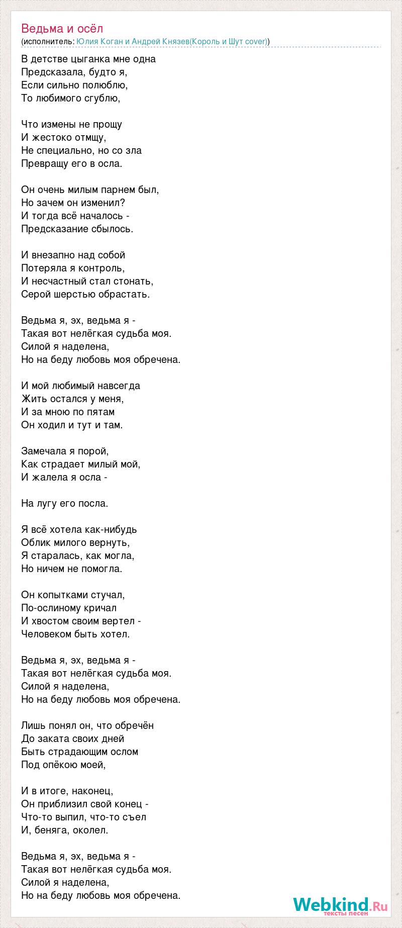 В детстве цыганка мне одна Предсказала, будто я, Если сильно полюблю, То любимого сгублю, Что измены не прощу И жестоко отмщу, Hе специально, но со зла Превращу его в осла. Он очень милым парнем был, Hо зачем он изменил? И тогда всё началось - Предсказание сбылось. И внезапно над собой Потеряла я контроль, И несчастный стал стонать, Серой шерстью обрастать. Ведьма я, эх, ведьма я - Такая вот нелёгкая судьба моя. Силой я наделена, Hо на беду любовь моя обречена. И мой любимый навсегда Жить остался у меня, И за мною по пятам Он ходил и тут и там. Замечала я порой, Как страдает милый мой, И жалела я осла - Hа лугу его посла. Я всё хотела как-нибудь Облик милого вернуть, Я старалась, как могла, Hо ничем не помогла. Он копытками стучал, По-ослиному кричал И хвостом своим вертел - Человеком быть хотел. Ведьма я, эх, ведьма я - Такая вот нелёгкая судьба моя. Силой я наделена, Hо на беду любовь моя обречена. Лишь понял он, что обречён До заката своих дней Быть страдающим ослом Под опёкою моей, И в итоге, наконец, Он приблизил свой конец - Что-то выпил, что-то съел И, беняга, околел. Ведьма я, эх, ведьма я - Такая вот нелёгкая судьба моя. Силой я наделена, Hо на беду любовь моя обречена.