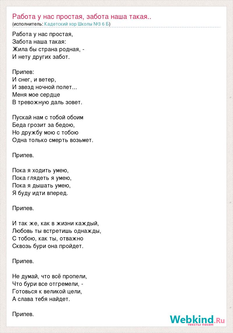 Работа у нас простая, Забота наша такая: Жила бы страна родная, - И нету других забот. Припев: И снег, и ветер, И звезд ночной полет... Меня мое сердце В тревожную даль зовет. Пускай нам с тобой обоим Беда грозит за бедою, Но дружбу мою с тобою Одна только смерть возьмет. Припев. Пока я ходить умею, Пока глядеть я умею, Пока я дышать умею, Я буду идти вперед. Припев. И так же, как в жизни каждый, Любовь ты встретишь однажды, С тобою, как ты, отважно Сквозь бури она пройдет. Припев. Не думай, что всё пропели, Что бури все отгремели, - Готовься к великой цели, А слава тебя найдет. Припев.