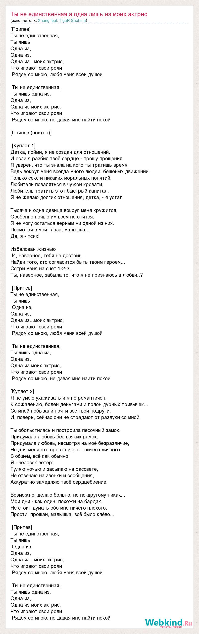 [Припев] Ты не единственная, Ты лишь Одна из, Одна из, Одна из...моих актрис, Что играют свои роли Рядом со мною, любя меня всей душой Ты не единственная, Ты лишь одна из, Одна из, Одна из моих актрис, Что играют свои роли Рядом со мною, не давая мне найти покой [Припев (повтор)] [Куплет 1] Детка, пойми, я не создан для отношений. И если я разбил твоё сердце - прошу прощения. Я уверен, что ты знала на кого ты тратишь время, Ведь вокруг меня всегда много людей, бешеных движений. Только секс и никаких моральных понятий. Любитель поваляться в чужой кровати, Любитель тратить этот быстрый капитал. Я не желаю долгих отношения, детка, - я устал. Тысяча и одна девица вокруг меня кружится, Особенно ночью им всем не спится. Я не могу остаться верным ни одной из них. Посмотри в мои глаза, малышка... Да, я - псих! Избалован жизнью И, наверное, тебя не достоин... Найди того, кто согласится быть твоим героем... Сотри меня на счет 1-2-3, Ты, наверное, забыла то, что я не признаюсь в любви..? [Припев] Ты не единственная, Ты лишь Одна из, Одна из, Одна из...моих актрис, Что играют свои роли Рядом со мною, любя меня всей душой Ты не единственная, Ты лишь одна из, Одна из, Одна из моих актрис, Что играют свои роли Рядом со мною, не давая мне найти покой [Куплет 2] Я не умею ухаживать и я не романтичен. К сожалению, болен деньгами и полон дурных привычек... Со мной побывали почти все твои подруги, И, поверь, сейчас они не страдают от разлуки со мной. Ты обольстилась и построила песочный замок. Придумала любовь без всяких рамок. Придумала любовь, несмотря на моё безразличие, Но для меня это просто игра... ничего личного. В общем, всё как обычно: Я - человек ветер: Гуляю ночью и засыпаю на рассвете, Не отвечаю на звонки и сообщения, Аккуратно замедляю твоё сердцебиение. Возможно, делаю больно, но по-другому никак... Мои дни - как один: похожи на бардак. Не стоит думать обо мне ничего плохого. Прости, прощай, малышка, всё было клёво... [Припев] Ты не единственная, Ты лишь Одна из, Одна из, Одна из...моих актрис, Что играют свои роли Рядом со мною, любя меня всей душой Ты не единственная, Ты лишь одна из, Одна из, Одна из моих актрис, Что играют свои роли Рядом со мною, не давая мне найти покой