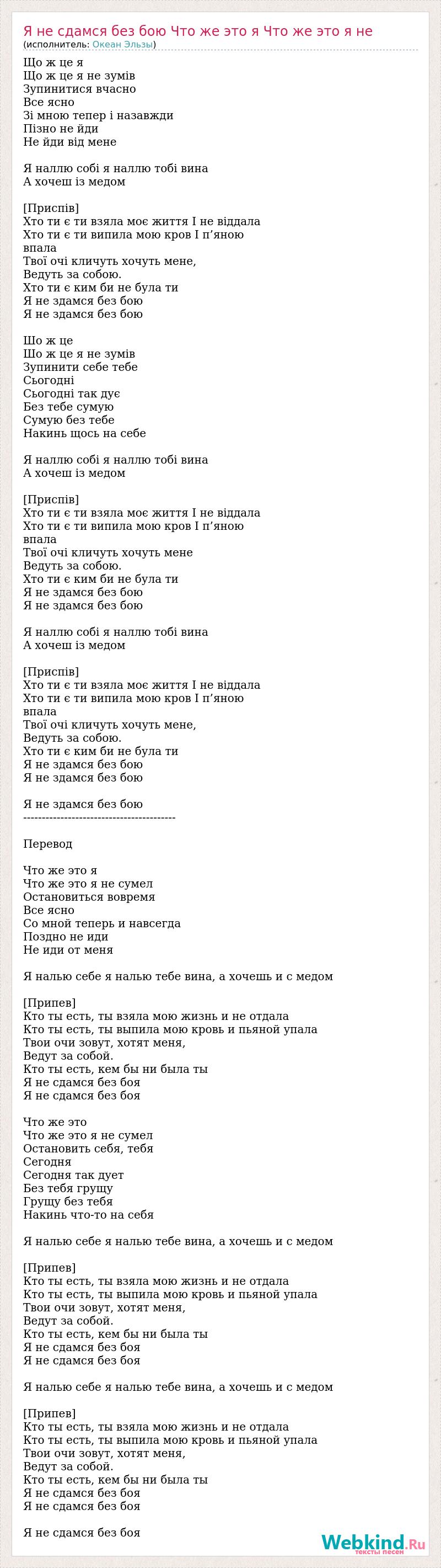Що ж це я Що ж це я не зумів Зупинитися вчасно Все ясно Зі мною тепер і назавжди Пізно не йди Не йди від мене Я наллю собі я наллю тобі вина А хочеш із медом [Приспів] Хто ти є ти взяла моє життя І не віддала Хто ти є ти випила мою кров І п’яною впала Твої очі кличуть хочуть мене, Ведуть за собою. Хто ти є ким би не була ти Я не здамся без бою Я не здамся без бою Шо ж це Шо ж це я не зумів Зупинити себе тебе Сьогодні Сьогодні так дує Без тебе сумую Сумую без тебе Накинь щось на себе Я наллю собі я наллю тобі вина А хочеш із медом [Приспів] Хто ти є ти взяла моє життя І не віддала Хто ти є ти випила мою кров І п’яною впала Твої очі кличуть хочуть мене Ведуть за собою. Хто ти є ким би не була ти Я не здамся без бою Я не здамся без бою Я наллю собі я наллю тобі вина А хочеш із медом [Приспів] Хто ти є ти взяла моє життя І не віддала Хто ти є ти випила мою кров І п’яною впала Твої очі кличуть хочуть мене, Ведуть за собою. Хто ти є ким би не була ти Я не здамся без бою Я не здамся без бою Я не здамся без бою ----------------------------------------- Перевод Что же это я Что же это я не сумел Остановиться вовремя Все ясно Со мной теперь и навсегда Поздно не иди Не иди от меня Я налью себе я налью тебе вина, а хочешь и с медом [Припев] Кто ты есть, ты взяла мою жизнь и не отдала Кто ты есть, ты выпила мою кровь и пьяной упала Твои очи зовут, хотят меня, Ведут за собой. Кто ты есть, кем бы ни была ты Я не сдамся без боя Я не сдамся без боя Что же это Что же это я не сумел Остановить себя, тебя Сегодня Сегодня так дует Без тебя грущу Грущу без тебя Накинь что-то на себя Я налью себе я налью тебе вина, а хочешь и с медом [Припев] Кто ты есть, ты взяла мою жизнь и не отдала Кто ты есть, ты выпила мою кровь и пьяной упала Твои очи зовут, хотят меня, Ведут за собой. Кто ты есть, кем бы ни была ты Я не сдамся без боя Я не сдамся без боя Я налью себе я налью тебе вина, а хочешь и с медом [Припев] Кто ты есть, ты взяла мою жизнь и не отдала Кто ты есть, ты выпила мою кровь и пьяной упала Твои очи зовут, хотят меня, Ведут за собой. Кто ты есть, кем бы ни была ты Я не сдамся без боя Я не сдамся без боя Я не сдамся без боя