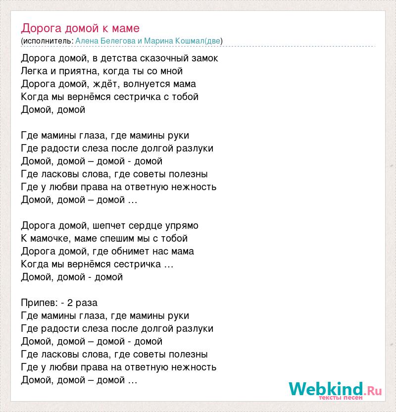 Дорога домой, в детства сказочный замок Легка и приятна, когда ты со мной Дорога домой, ждёт, волнуется мама Когда мы вернёмся сестричка с тобой Домой, домой Где мамины глаза, где мамины руки Где радости слеза после долгой разлуки Домой, домой – домой - домой Где ласковы слова, где советы полезны Где у любви права на ответную нежность Домой, домой – домой … Дорога домой, шепчет сердце упрямо К мамочке, маме спешим мы с тобой Дорога домой, где обнимет нас мама Когда мы вернёмся сестричка … Домой, домой - домой Припев: - 2 раза Где мамины глаза, где мамины руки Где радости слеза после долгой разлуки Домой, домой – домой - домой Где ласковы слова, где советы полезны Где у любви права на ответную нежность Домой, домой – домой …