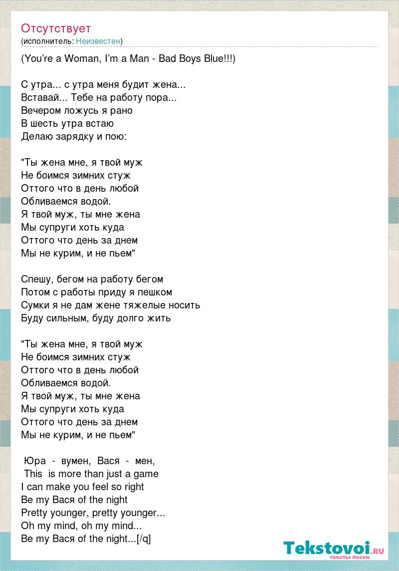 (You’re a Woman, I’m a Man - Bad Boys Blue!!!) С утра... с утра меня будит жена... Вставай... Тебе на работу пора... Вечером ложусь я рано В шесть утра встаю Делаю зарядку и пою: "Ты жена мне, я твой муж Не боимся зимних стуж Оттого что в день любой Обливаемся водой. Я твой муж, ты мне жена Мы супруги хоть куда Оттого что день за днем Мы не курим, и не пьем" Спешу, бегом на работу бегом Потом с работы приду я пешком Сумки я не дам жене тяжелые носить Буду сильным, буду долго жить "Ты жена мне, я твой муж Не боимся зимних стуж Оттого что в день любой Обливаемся водой. Я твой муж, ты мне жена Мы супруги хоть куда Оттого что день за днем Мы не курим, и не пьем" Юра - вумен, Вася - мен, This is more than just a game I can make you feel so right Be my Вася of the night Pretty younger, pretty younger... Oh my mind, oh my mind... Be my Вася of the night...[/q]