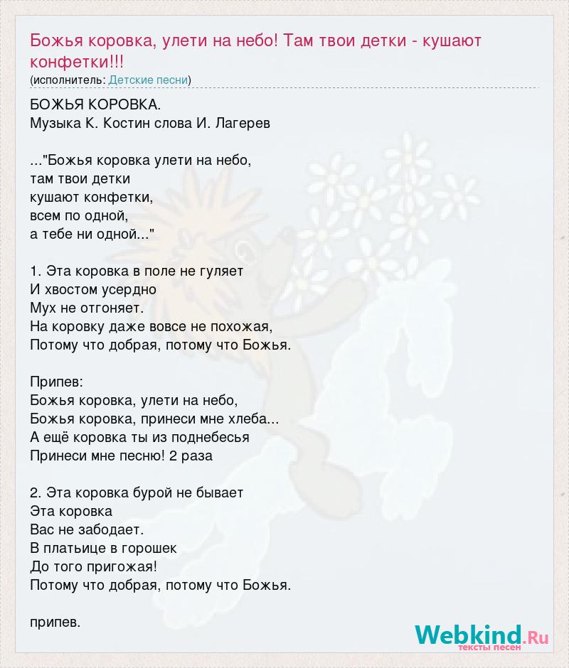 БОЖЬЯ КОРОВКА. Музыка К. Костин слова И. Лагерев ..."Божья коровка улети на небо, там твои детки кушают конфетки, всем по одной, а тебе ни одной..." 1. Эта коровка в поле не гуляет И хвостом усердно Мух не отгоняет. На коровку даже вовсе не похожая, Потому что добрая, потому что Божья. Припев: Божья коровка, улети на небо, Божья коровка, принеси мне хлеба... А ещё коровка ты из поднебесья Принеси мне песню! 2 раза 2. Эта коровка бурой не бывает Эта коровка Вас не забодает. В платьице в горошек До того пригожая! Потому что добрая, потому что Божья. припев.