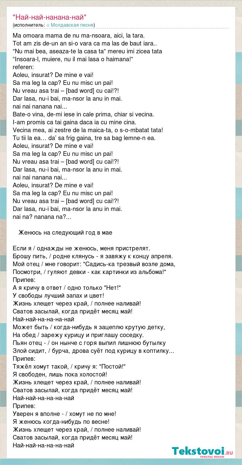 Ma omoara mama de nu ma-nsoara, aici, la tara. Tot am zis de-un an si-o vara ca ma las de baut iara.. “Nu mai bea, aseaza-te la casa ta” mereu imi zicea tata “Insoara-l, muiere, nu il mai lasa o haimana!” referen: Aoleu, insurat? De mine e vai! Sa ma leg la cap? Eu nu misc un pai! Nu vreau asa trai – [bad word] cu cai!?! Dar lasa, nu-i bai, ma-nsor la anu in mai. nai nai nanana nai... Bate-o vina, de-mi iese in cale prima, chiar si vecina. I-am promis ca tai gaina daca ia cu mine cina. Vecina mea, ai zestre de la maica-ta, o s-o-mbatat tata! Tu tii la ea… da’ sa frig gaina, tre sa bag lemne-n ea. Aoleu, insurat? De mine e vai! Sa ma leg la cap? Eu nu misc un pai! Nu vreau asa trai – [bad word] cu cai!?! Dar lasa, nu-i bai, ma-nsor la anu in mai. nai nai nanana nai... Aoleu, insurat? De mine e vai! Sa ma leg la cap? Eu nu misc un pai! Nu vreau asa trai – [bad word] cu cai!?! Dar lasa, nu-i bai, ma-nsor la anu in mai. nai na? nanana na?... Женюсь на следующий год в мае Если я / однажды не женюсь, меня пристрелят. Брошу пить, / родне клянусь - я завяжу к концу апреля. Мой отец / мне говорит: "Садись-ка трезвый возле дома, Посмотри, / гуляют девки - как картинки из альбома!" Припев: А я кричу в ответ / одно только "Нет!" У свободы лучший запах и цвет! Жизнь хлещет через край, / полнее наливай! Сватов засылай, когда придёт месяц май! Най-най-на-на-на-най Может быть / когда-нибудь я зацеплю крутую детку, На обед / зарежу курицу и приглашу соседку. Пьян отец - / он нынче с горя выпил лишнюю бутылку Злой сидит, / бурча, дрова суёт под курицу в коптилку... Припев: Тяжёл хомут такой, / кричу я: "Постой!" Я свободен, лишь пока холостой! Жизнь хлещет через край, / полнее наливай! Сватов засылай, когда придёт месяц май! Най-най-на-на-на-най Припев: Уверен я вполне - / хомут не по мне! Я женюсь когда-нибудь по весне! Жизнь хлещет через край, / полнее наливай! Сватов засылай, когда придёт месяц май! Най-най-на-на-на-най