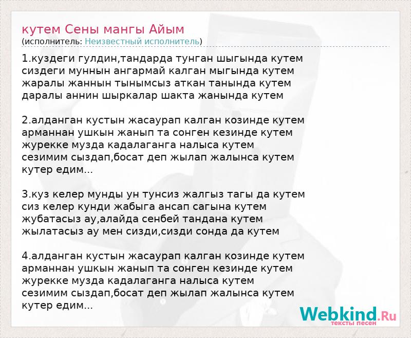 1.куздеги гулдин,тандарда тунган шыгында кутем сиздеги муннын ангармай калган мыгында кутем жаралы жаннын тынымсыз аткан танында кутем даралы аннин шыркалар шакта жанында кутем 2.алданган кустын жасаурап калган козинде кутем арманнан ушкын жанып та сонген кезинде кутем журекке музда кадалаганга налыса кутем сезимим сыздап,босат деп жылап жалынса кутем кутер едим... 3.куз келер мунды ун тунсиз жалгыз тагы да кутем сиз келер кунди жабыга ансап сагына кутем жубатасыз ау,алайда сенбей тандана кутем жылатасыз ау мен сизди,сизди сонда да кутем 4.алданган кустын жасаурап калган козинде кутем арманнан ушкын жанып та сонген кезинде кутем журекке музда кадалаганга налыса кутем сезимим сыздап,босат деп жылап жалынса кутем кутер едим...