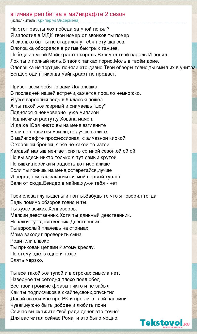 На этот раз,ты лох,победа за мной понял? Я запостил в МДК твой номер,от звонков ты помер И сколько бы ты не старался,у тебя нету шансов. Ололошка обосрался,в ритме быстрых танцев. Победа за мной.Майнкрафта король.Взломал твой пароль.И понял. Лох ты и полный ноль.В твоих папках порно.Моль в твоём доме. Ололошка не торт,мы поняли это давно.Твои обзоры говно,ты смыл их в унитаз. Бендер один никогда майнкрафт не продаст. Привет всем,ребят,с вами Лололошка С последней нашей встречи,кажется,прошло немножко. Я уже взрослый,ведь,в 9 класс я пошёл А ты такой же жирный и снимаешь "шоу" Поднялся я неимоверно ,уже миллион Подписчики растут,у Хована мамон. И даже Юзя никто,вы на меня взгляните Если не нравится мои лп,то лучше валите. В майнкрафте профессионал, с алмазной киркой С хорошей броней, я же не какой то изгой. Каждый малыш мечтает,снять со мной сезон,ой ой ой Но вы здесь никто,только я тут самый крутой. Поняшки,персики и радость,вот моё клише Если ты гонишь на меня,остерегайся,лучше И перед тем,как закончится мой первый куплет Вали от сюда,Бендер,в майна,хуже тебя - нет Твои слова глупы,деньги понты.Забудь то что я говорил тогда Ведь помимо обзоров говно и ты. Ты хуже всяких Хеппизоров. Мелкий девственник.Хотя ты длинный девственник. Но ключ тут девственник.Девственник. Ты взрослый плачешь на стримах Мама заходит проверить сына Родители в шоке Ты прикован цепями к этому креслу. По этому одетв одно и тоже Блять мерзко. Ты всё такой же тупой и в строках смысла нет. Наверное ты сегодня,плохо поел обед. Все твои громкие фразы никто и не забыл Как ты подписчиков в скайпе,своих,опуситил Давай скажи мне про РК и про лигз глой напомни Чувак,нужно быть добрее и любить пони Сейчас вы скажите-"всё ради денег,это точно" Для вас читал сейчас Рома, и это было мощно.