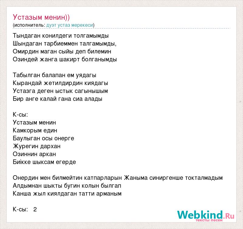 Тындаган конилдеги толгамымды Шындаган тарбиеммен талгамымды, Омирдин маган сыйы деп билемин Озиндей жанга шакирт болганымды Табылган балапан ем уядагы Кырандай жетилдирдин киядагы Устазга деген ыстык сагынышым Бир анге калай гана сиа алады К-сы: Устазым менин Камкорым един Баулыган осы онерге Журегин дархан Озиннин аркан Биiкке шыксам егерде Онердин мен билмейтин катпарларын Жаныма синиргенше токталмадым Алдымнан шыкты бугин колын былгап Канша жыл киялдаган татти арманым К-сы: 2