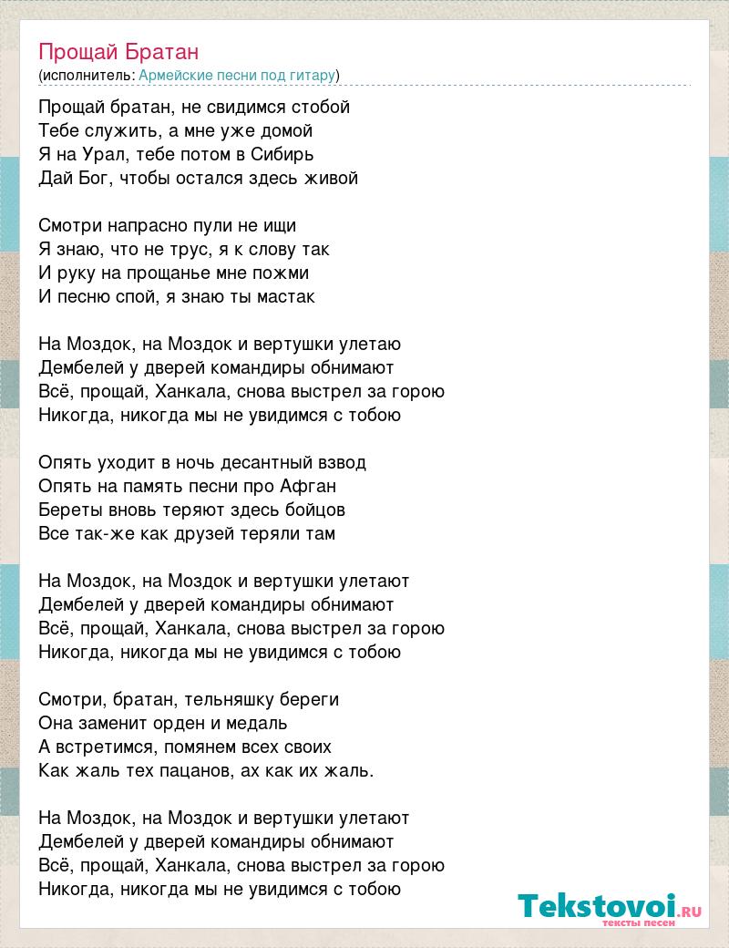 Прощай братан, не свидимся стобой Тебе служить, а мне уже домой Я на Урал, тебе потом в Сибирь Дай Бог, чтобы остался здесь живой Смотри напрасно пули не ищи Я знаю, что не трус, я к слову так И руку на прощанье мне пожми И песню спой, я знаю ты мастак На Моздок, на Моздок и вертушки улетаю Дембелей у дверей командиры обнимают Всё, прощай, Ханкала, снова выстрел за горою Никогда, никогда мы не увидимся с тобою Опять уходит в ночь десантный взвод Опять на память песни про Афган Береты вновь теряют здесь бойцов Все так-же как друзей теряли там На Моздок, на Моздок и вертушки улетают Дембелей у дверей командиры обнимают Всё, прощай, Ханкала, снова выстрел за горою Никогда, никогда мы не увидимся с тобою Смотри, братан, тельняшку береги Она заменит орден и медаль А встретимся, помянем всех своих Как жаль тех пацанов, ах как их жаль. На Моздок, на Моздок и вертушки улетают Дембелей у дверей командиры обнимают Всё, прощай, Ханкала, снова выстрел за горою Никогда, никогда мы не увидимся с тобою