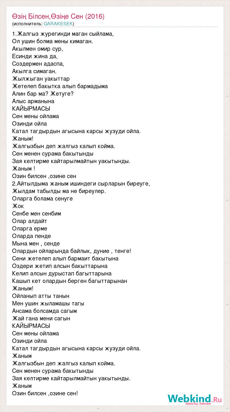 1.Жалгыз журегинди маган сыйлама, Ол ушин болма мены кимаган. Акылмен омир сур, Есинди жина да, Создермен адаспа, Акылга симаган. Жылжыган уакыттар Жетелеп бакытка алып бармадыма Алин бар ма? Жетуге? Алыс арманына КАЙЫРМАСЫ Сен мены ойлама Озинди ойла Катал тагдырдын агысына карсы жузуди ойла. Жаным! Жалгызбын деп жалгыз калып койма. Сен менен сурама бакытынды Зая келтирме кайтарылмайтын уакытынды. Жаным ! Озин билсен ,озине сен 2.Айтылдыма жаным ишиндеги сырларын биреуге, Жылдам табылды ма не биреулер. Оларга болама сенуге Жок Сенбе мен сенбим Олар алдайт Оларга ерме Оларда пенде Мына мен , сенде Олардын ойларында байлык, дуние , тенге! Сени жетелеп алып бармаит бакытына Оздери жетип алсын бакыттарына Келип алсын дурыстап багыттарына Кашып кет олардын берген багыттарынан Жаным! Ойланып атты танын Мен ушин жыламашы тагы Ансама болсамда сагым Жай гана мени сагын КАЙЫРМАСЫ Сен мены ойлама Озинди ойла Катал тагдырдын агысына карсы жузуди ойла. Жаным Жалгызбын деп жалгыз калып койма. Сен менен сурама бакытынды Зая келтирме кайтарылмайтын уакытынды. Жаным Озин билсен ,озине сен!