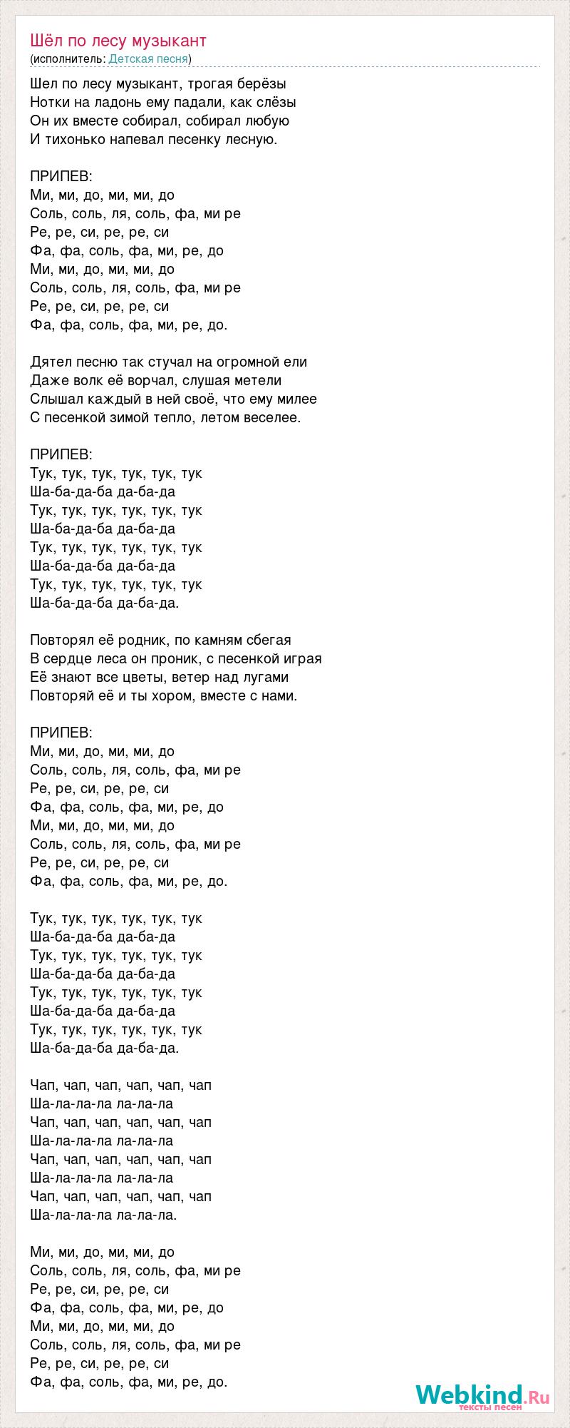 Шел по лесу музыкант, трогая берёзы Нотки на ладонь ему падали, как слёзы Он их вместе собирал, собирал любую И тихонько напевал песенку лесную. ПРИПЕВ: Ми, ми, до, ми, ми, до Соль, соль, ля, соль, фа, ми ре Ре, ре, си, ре, ре, си Фа, фа, соль, фа, ми, ре, до Ми, ми, до, ми, ми, до Соль, соль, ля, соль, фа, ми ре Ре, ре, си, ре, ре, си Фа, фа, соль, фа, ми, ре, до. Дятел песню так стучал на огромной ели Даже волк её ворчал, слушая метели Слышал каждый в ней своё, что ему милее С песенкой зимой тепло, летом веселее. ПРИПЕВ: Тук, тук, тук, тук, тук, тук Ша-ба-да-ба да-ба-да Тук, тук, тук, тук, тук, тук Ша-ба-да-ба да-ба-да Тук, тук, тук, тук, тук, тук Ша-ба-да-ба да-ба-да Тук, тук, тук, тук, тук, тук Ша-ба-да-ба да-ба-да. Повторял её родник, по камням сбегая В сердце леса он проник, с песенкой играя Её знают все цветы, ветер над лугами Повторяй её и ты хором, вместе с нами. ПРИПЕВ: Ми, ми, до, ми, ми, до Соль, соль, ля, соль, фа, ми ре Ре, ре, си, ре, ре, си Фа, фа, соль, фа, ми, ре, до Ми, ми, до, ми, ми, до Соль, соль, ля, соль, фа, ми ре Ре, ре, си, ре, ре, си Фа, фа, соль, фа, ми, ре, до. Тук, тук, тук, тук, тук, тук Ша-ба-да-ба да-ба-да Тук, тук, тук, тук, тук, тук Ша-ба-да-ба да-ба-да Тук, тук, тук, тук, тук, тук Ша-ба-да-ба да-ба-да Тук, тук, тук, тук, тук, тук Ша-ба-да-ба да-ба-да. Чап, чап, чап, чап, чап, чап Ша-ла-ла-ла ла-ла-ла Чап, чап, чап, чап, чап, чап Ша-ла-ла-ла ла-ла-ла Чап, чап, чап, чап, чап, чап Ша-ла-ла-ла ла-ла-ла Чап, чап, чап, чап, чап, чап Ша-ла-ла-ла ла-ла-ла. Ми, ми, до, ми, ми, до Соль, соль, ля, соль, фа, ми ре Ре, ре, си, ре, ре, си Фа, фа, соль, фа, ми, ре, до Ми, ми, до, ми, ми, до Соль, соль, ля, соль, фа, ми ре Ре, ре, си, ре, ре, си Фа, фа, соль, фа, ми, ре, до.