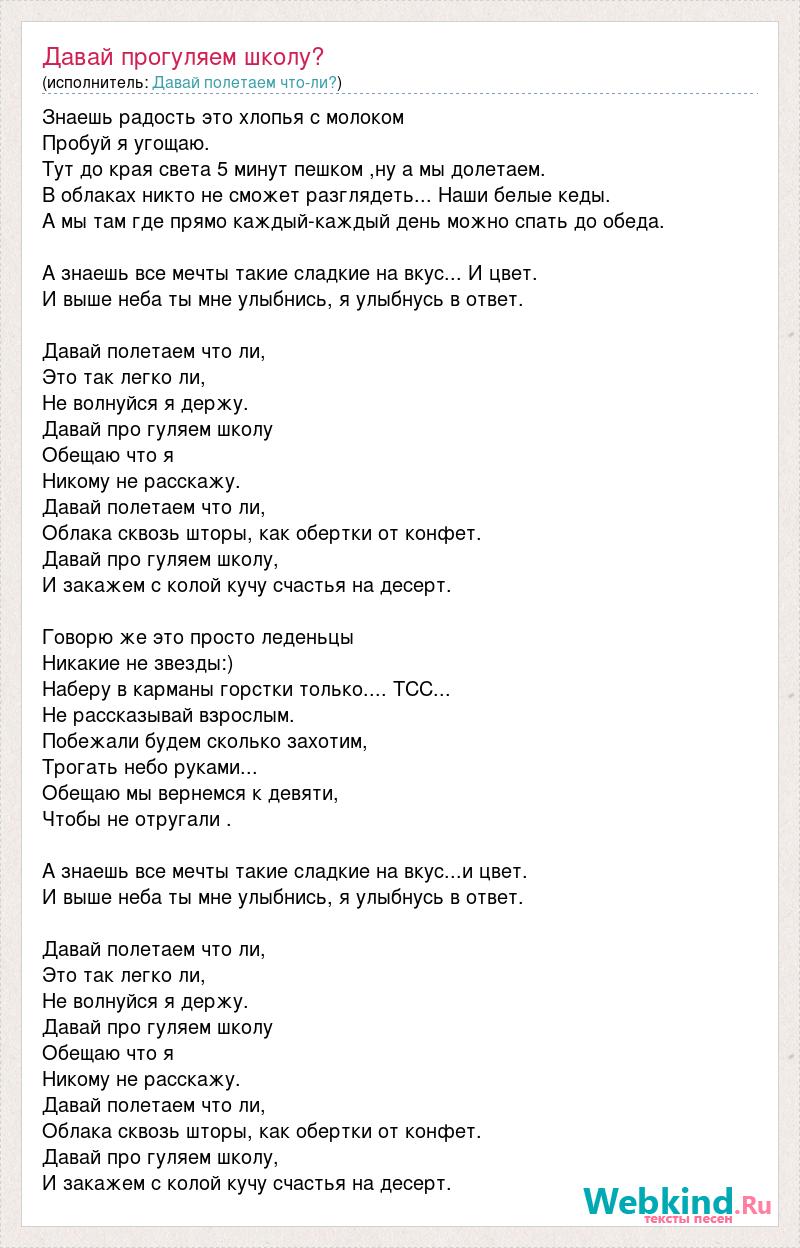 Знаешь радость это хлопья с молоком Пробуй я угощаю. Тут до края света 5 минут пешком ,ну а мы долетаем. В облаках никто не сможет разглядеть... Наши белые кеды. А мы там где прямо каждый-каждый день можно спать до обеда. А знаешь все мечты такие сладкие на вкус... И цвет. И выше неба ты мне улыбнись, я улыбнусь в ответ. Давай полетаем что ли, Это так легко ли, Не волнуйся я держу. Давай про гуляем школу Обещаю что я Никому не расскажу. Давай полетаем что ли, Облака сквозь шторы, как обертки от конфет. Давай про гуляем школу, И закажем с колой кучу счастья на десерт. Говорю же это просто леденьцы Никакие не звезды:) Наберу в карманы горстки только.... ТСС... Не рассказывай взрослым. Побежали будем сколько захотим, Трогать небо руками... Обещаю мы вернемся к девяти, Чтобы не отругали . А знаешь все мечты такие сладкие на вкус...и цвет. И выше неба ты мне улыбнись, я улыбнусь в ответ. Давай полетаем что ли, Это так легко ли, Не волнуйся я держу. Давай про гуляем школу Обещаю что я Никому не расскажу. Давай полетаем что ли, Облака сквозь шторы, как обертки от конфет. Давай про гуляем школу, И закажем с колой кучу счастья на десерт.