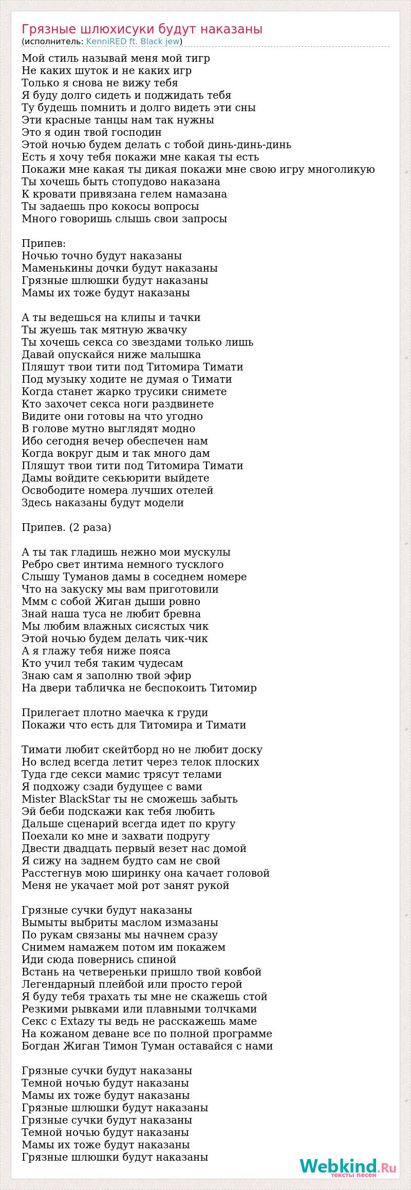 Мой стиль называй меня мой тигр Не каких шуток и не каких игр Только я снова не вижу тебя Я буду долго сидеть и поджидать тебя Ту будешь помнить и долго видеть эти сны Эти красные танцы нам так нужны Это я один твой господин Этой ночью будем делать с тобой динь-динь-динь Есть я хочу тебя покажи мне какая ты есть Покажи мне какая ты дикая покажи мне свою игру многоликую Ты хочешь быть стопудово наказана К кровати привязана гелем намазана Ты задаешь про кокосы вопросы Много говоришь слышь свои запросы Припев: Ночью точно будут наказаны Маменькины дочки будут наказаны Грязные шлюшки будут наказаны Мамы их тоже будут наказаны А ты ведешься на клипы и тачки Ты жуешь так мятную жвачку Ты хочешь секса со звездами только лишь Давай опускайся ниже малышка Пляшут твои тити под Титомира Тимати Под музыку ходите не думая о Тимати Когда станет жарко трусики снимете Кто захочет секса ноги раздвинете Видите они готовы на что угодно В голове мутно выглядят модно Ибо сегодня вечер обеспечен нам Когда вокруг дым и так много дам Пляшут твои тити под Титомира Тимати Дамы войдите секьюрити выйдете Освободите номера лучших отелей Здесь наказаны будут модели Припев. (2 раза) А ты так гладишь нежно мои мускулы Ребро свет интима немного тусклого Слышу Туманов дамы в соседнем номере Что на закуску мы вам приготовили Ммм с собой Жиган дыши ровно Знай наша туса не любит бревна Мы любим влажных сисястых чик Этой ночью будем делать чик-чик А я глажу тебя ниже пояса Кто учил тебя таким чудесам Знаю сам я заполню твой эфир На двери табличка не беспокоить Титомир Прилегает плотно маечка к груди Покажи что есть для Титомира и Тимати Тимати любит скейтборд но не любит доску Но вслед всегда летит через телок плоских Туда где секси мамис трясут телами Я подхожу сзади будущее с вами Mister BlackStar ты не сможешь забыть Эй беби подскажи как тебя любить Дальше сценарий всегда идет по кругу Поехали ко мне и захвати подругу Двести двадцать первый везет нас домой Я сижу на заднем будто сам не свой Расстегнув мою ширинку она качает головой Меня не укачает мой рот занят рукой Грязные сучки будут наказаны Вымыты выбриты маслом измазаны По рукам связаны мы начнем сразу Снимем намажем потом им покажем Иди сюда повернись спиной Встань на четвереньки пришло твой ковбой Легендарный плейбой или просто герой Я буду тебя трахать ты мне не скажешь стой Резкими рывками или плавными толчками Секс с Extazy ты ведь не расскажешь маме На кожаном деване все по полной программе Богдан Жиган Тимон Туман оставайся с нами Грязные сучки будут наказаны Темной ночью будут наказаны Мамы их тоже будут наказаны Грязные шлюшки будут наказаны Грязные сучки будут наказаны Темной ночью будут наказаны Мамы их тоже будут наказаны Грязные шлюшки будут наказаны