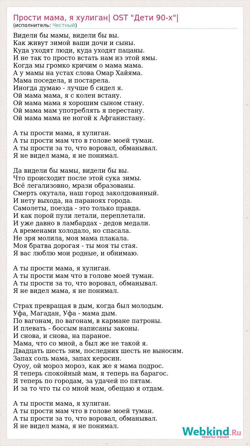 Видели бы мамы, видели бы вы. Как живут зимой ваши дочи и сыны. Куда уходят люди, куда уходят пацаны. И не так то просто встать нам из этой ямы. Когда мы громко кричим о мама мама. А у мамы на устах слова Омар Хайяма. Мама поседела, и постарела. Иногда думаю - лучше б сидел я. Ой мама мама, я с колен встану. Ой мама мама я хорошим сыном стану. Ой мама мам употреблять я перестану. Ой мама мама не ногой к Афганистану. А ты прости мама, я хулиган. А ты прости мам что в голове моей туман. А ты прости за то, что воровал, обманывал. Я не видел мама, я не понимал. Да видели бы мамы, видели бы вы. Что происходит после этой сука зимы. Всё легализовно, мрази образованы. Смерть окутала, наш город заколдованный. И нету выхода, на параноях города. Самолеты, поезда - это только правда. И как порой пули летали, переплетали. И уже давно в ламбардах - дедов медали. А временами холодало, но спасала. Не зря молила, моя мама плакала. Моя братва дорогая - ты моя ты стая. Я вас люблю мои родные, и обнимаю. А ты прости мама, я хулиган. А ты прости мам что в голове моей туман. А ты прости за то, что воровал, обманывал. Я не видел мама, я не понимал. Страх превращая в дым, когда был молодым. Уфа, Магадан, Уфа - мама дым. По вагонам, по вагонам, в кармане патроны. И плевать - боссым написаны законы. И снова, и снова, на параное. Мама, что со мной, а был же не такой я. Двадцать шесть зим, последних шесть не выносим. Запах соль мама, запах керосин. Оуоу, ой мороз мороз, как же я мама подрос. Я теперь спокойный мам, я теперь на барагос. Я теперь по городам, за удачей по пятам. И за то что ты со мной мам, обещаю я отдам. А ты прости мама, я хулиган. А ты прости мам что в голове моей туман. А ты прости за то, что воровал, обманывал. Я не видел мама, я не понимал.
