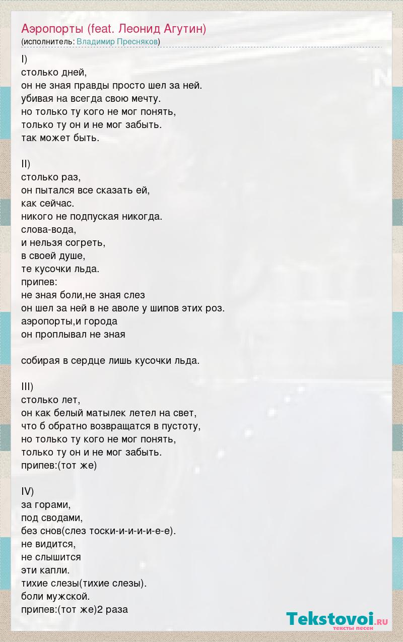 I) столько дней, он не зная правды просто шел за ней. убивая на всегда свою мечту. но только ту кого не мог понять, только ту он и не мог забыть. так может быть. II) столько раз, он пытался все сказать ей, как сейчас. никого не подпуская никогда. слова-вода, и нельзя согреть, в своей душе, те кусочки льда. припев: не зная боли,не зная слез он шел за ней в не аволе у шипов этих роз. аэропорты,и города он проплывал не зная собирая в сердце лишь кусочки льда. III) столько лет, он как белый матылек летел на свет, что б обратно возвращатся в пустоту, но только ту кого не мог понять, только ту он и не мог забыть. припев:(тот же) IV) за горами, под сводами, без снов(слез тоски-и-и-и-и-е-е). не видится, не слышится эти капли. тихие слезы(тихие слезы). боли мужской. припев:(тот же)2 раза