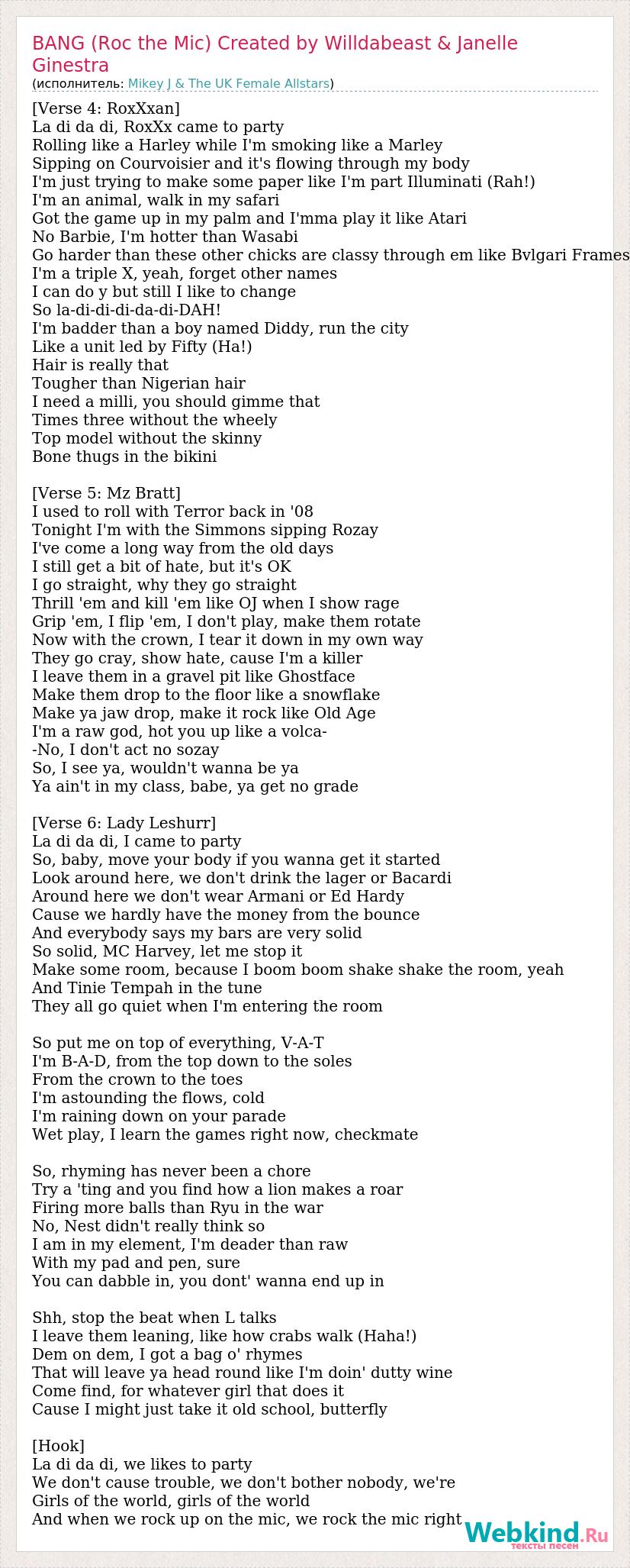 Главная→Исполнители→Mikey J & The UK Female Allstars→BANG (Roc the Mic) Created by Willdabeast & Janelle Ginestra