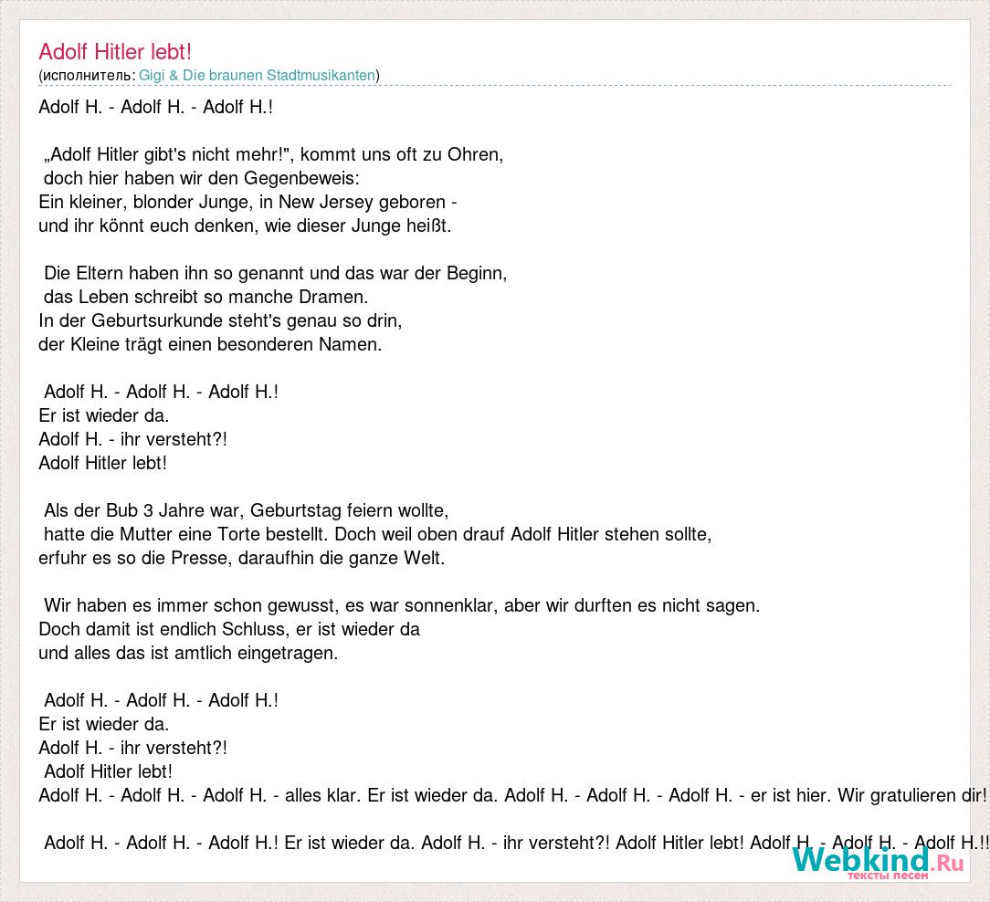 Adolf H. - Adolf H. - Adolf H.! „Adolf Hitler gibt's nicht mehr!", kommt uns oft zu Ohren, doch hier haben wir den Gegenbeweis: Ein kleiner, blonder Junge, in New Jersey geboren - und ihr könnt euch denken, wie dieser Junge heißt. Die Eltern haben ihn so genannt und das war der Beginn, das Leben schreibt so manche Dramen. In der Geburtsurkunde steht's genau so drin, der Kleine trägt einen besonderen Namen. Adolf H. - Adolf H. - Adolf H.! Er ist wieder da. Adolf H. - ihr versteht?! Adolf Hitler lebt! Als der Bub 3 Jahre war, Geburtstag feiern wollte, hatte die Mutter eine Torte bestellt. Doch weil oben drauf Adolf Hitler stehen sollte, erfuhr es so die Presse, daraufhin die ganze Welt. Wir haben es immer schon gewusst, es war sonnenklar, aber wir durften es nicht sagen. Doch damit ist endlich Schluss, er ist wieder da und alles das ist amtlich eingetragen. Adolf H. - Adolf H. - Adolf H.! Er ist wieder da. Adolf H. - ihr versteht?! Adolf Hitler lebt! Adolf H. - Adolf H. - Adolf H. - alles klar. Er ist wieder da. Adolf H. - Adolf H. - Adolf H. - er ist hier. Wir gratulieren dir! Adolf H. - Adolf H. - Adolf H.! Er ist wieder da. Adolf H. - ihr versteht?! Adolf Hitler lebt! Adolf H. - Adolf H. - Adolf H.!!