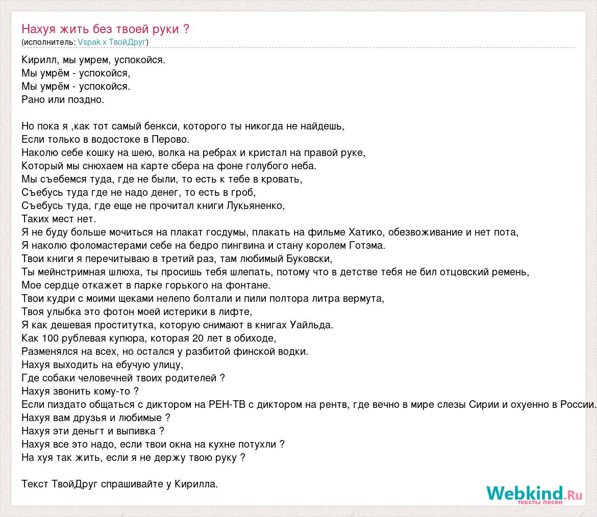 Кирилл, мы умрем, успокойся. Мы умрём - успокойся, Мы умрём - успокойся. Рано или поздно. Но пока я ,как тот самый бенкси, которого ты никогда не найдешь, Если только в водостоке в Перово. Наколю себе кошку на шею, волка на ребрах и кристал на правой руке, Который мы снюхаем на карте сбера на фоне голубого неба. Мы съебемся туда, где не были, то есть к тебе в кровать, Съебусь туда где не надо денег, то есть в гроб, Съебусь туда, где еще не прочитал книги Лукьяненко, Таких мест нет. Я не буду больше мочиться на плакат госдумы, плакать на фильме Хатико, обезвоживание и нет пота, Я наколю фоломастерами себе на бедро пингвина и стану королем Готэма. Твои книги я перечитываю в третий раз, там любимый Буковски, Ты мейнстримная шлюха, ты просишь тебя шлепать, потому что в детстве тебя не бил отцовский ремень, Мое сердце откажет в парке горького на фонтане. Твои кудри с моими щеками нелепо болтали и пили полтора литра вермута, Твоя улыбка это фотон моей истерики в лифте, Я как дешевая проститутка, которую снимают в книгах Уайльда. Как 100 рублевая купюра, которая 20 лет в обиходе, Разменялся на всех, но остался у разбитой финской водки. Нахуя выходить на ебучую улицу, Где собаки человечней твоих родителей ? Нахуя звонить кому-то ? Если пиздато общаться с диктором на РЕН-ТВ с диктором на рентв, где вечно в мире слезы Сирии и охуенно в России. Нахуя вам друзья и любимые ? Нахуя эти деньгт и выпивка ? Нахуя все это надо, если твои окна на кухне потухли ? На хуя так жить, если я не держу твою руку ? Текст ТвойДруг спрашивайте у Кирилла.