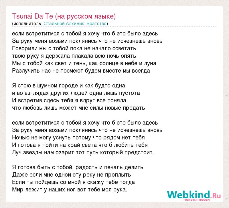 если встретитмся с тобой я хочу что б это было здесь За руку меня возьми поклянись что не исчезнешь вновь Говорили мы с тобой пока не начало ссветать твою руку я держала плакала всю ночь опять Мы с тобой как свет и тень, как солнце в небе и луна Разлучить нас не посмеют будем вместе мы всегда Я стою в шумном городе и как будто одна и во взглядах других людей одна лишь пустота И встретив сдесь тебя я вдруг все поняла что любовь лишь может мне силы новые предать если встретитмся с тобой я хочу что б это было здесь За руку меня возьми поклянись что не исчезнешь вновь Ночью не могу уснуть потому что рядом нет тебя И готова я пойти на край света что б любить тебя Луч звезды нам озарит тот путь который предстоит. Я готова быть с тобой, радость и печаль делить Даже если мне одной эту реку не проплыть Если ты пойдешь со мной я скажу тебе тогда Мир лежит у наших ног вот тебе моя рука.