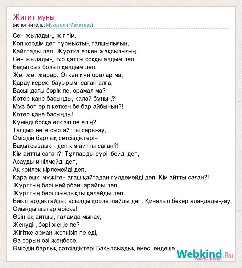 Сен жыладың, жігітім, Көп көрдім деп тұрмыстың тапшылығын, Қайтпады деп, Жұртқа еткен жақсылығың. Сен жыладың, Бір қатты соққы алдым деп, Бақытсыз болып қалдым деп. Жә, жә, жарар, Өткен күн оралар ма, Қарау керек, бауырым, саған алға, Басыңдағы бөрік пе, орамал ма? Көтер қане басыңды, қалай бұның?! Мұз боп еріп кеткен бе бар айбының?! Көтер қане басыңды! Күніңді босқа өткізіп пе едің? Тағдыр неге сыр айтты сары-ау, Өмірдің барлық сәтсіздіктерін Бақытсыздық - деп кім айтты саған?! Кім айтты саған?! Тұлпарды сүрінбейді деп, Асауды мінілмейді деп, Ақ көйлек кірлемейді деп, Қара ешкі мүжіген ағаш қайтадан гүлдемейді деп. Кім айтты саған?! Жұрттың бәрі мейірбан, арайлы деп, Жұрттың бәрі шындықты қалайды деп, Биікті ардақтайды, асылды қорлатпайды деп. Қиналып бекер алаңдадың-ау, Ойыңды шығар өріске! Өзің-ақ айтшы, ғаламда мынау, Жеңудің бәрі жеңіс пе? Жігітке арман жеткізіп пе еді, Өз сорын өзі жеңбесе. Өмірдің барлық сәтсіздіктері Бақытсыздық емес, ендеше.