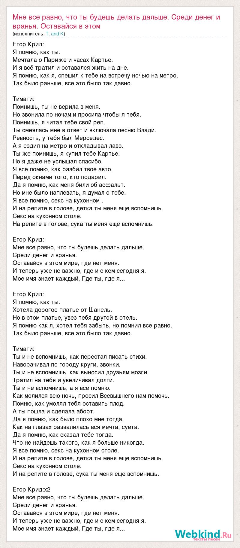 Егор Крид: Я помню, как ты. Мечтала о Париже и часах Картье. И я всё тратил и оставался жить на дне. Я помню, как я, спешил к тебе на встречу ночью на метро. Так было раньше, все это было так давно. Тимати: Помнишь, ты не верила в меня. Но звонила по ночам и просила чтобы я тебя. Помнишь, я читал тебе свой реп. Ты смеялась мне в ответ и включала песню Влади. Ревность, у тебя был Мерседес. А я ездил на метро и откладывал лавэ. Ты же помнишь, я купил тебе Картье. Но я даже не услышал спасибо. Я всё помню, как разбил твоё авто. Перед окнами того, кто подарил. Да я помню, как меня били об асфальт. Но мне было наплевать, я думал о тебе. Я все помню, секс на кухонном . И на репите в голове, детка ты меня еще вспомнишь. Секс на кухонном столе. На репите в голове, сука ты меня еще вспомнишь. Егор Крид: Мне все равно, что ты будешь делать дальше. Среди денег и вранья. Оставайся в этом мире, где нет меня. И теперь уже не важно, где и с кем сегодня я. Мое имя знает каждый, Где ты, где я... Егор Крид: Я помню, как ты. Хотела дорогое платье от Шанель. Но в этом платье, увез тебя другой в отель. Я помню как я, хотел тебя забыть, но помнил все равно. Так было раньше, все это было так давно. Тимати: Ты и не вспомнишь, как перестал писать стихи. Наворачивал по городу круги, звонки. Ты и не вспомнишь, как выносил друзьям мозги. Тратил на тебя и увеличивал долги. Ты и не вспомнишь, а я все помню. Как молился всю ночь, просил Всевышнего нам помочь. Помню, как умолял тебя оставить плод. А ты пошла и сделала аборт. Да я помню, как было плохо мне тогда. Как на глазах развалилась вся мечта, суета. Да я помню, как сказал тебе тогда. Что не найдешь такого, как я больше никогда. Я все помню, секс на кухонном столе. И на репите в голове, детка ты меня еще вспомнишь. Секс на кухонном столе. И на репите в голове, сука ты меня еще вспомнишь. Егор Крид:х2 Мне все равно, что ты будешь делать дальше. Среди денег и вранья. Оставайся в этом мире, где нет меня. И теперь уже не важно, где и с кем сегодня я. Мое имя знает каждый, Где ты, где я...