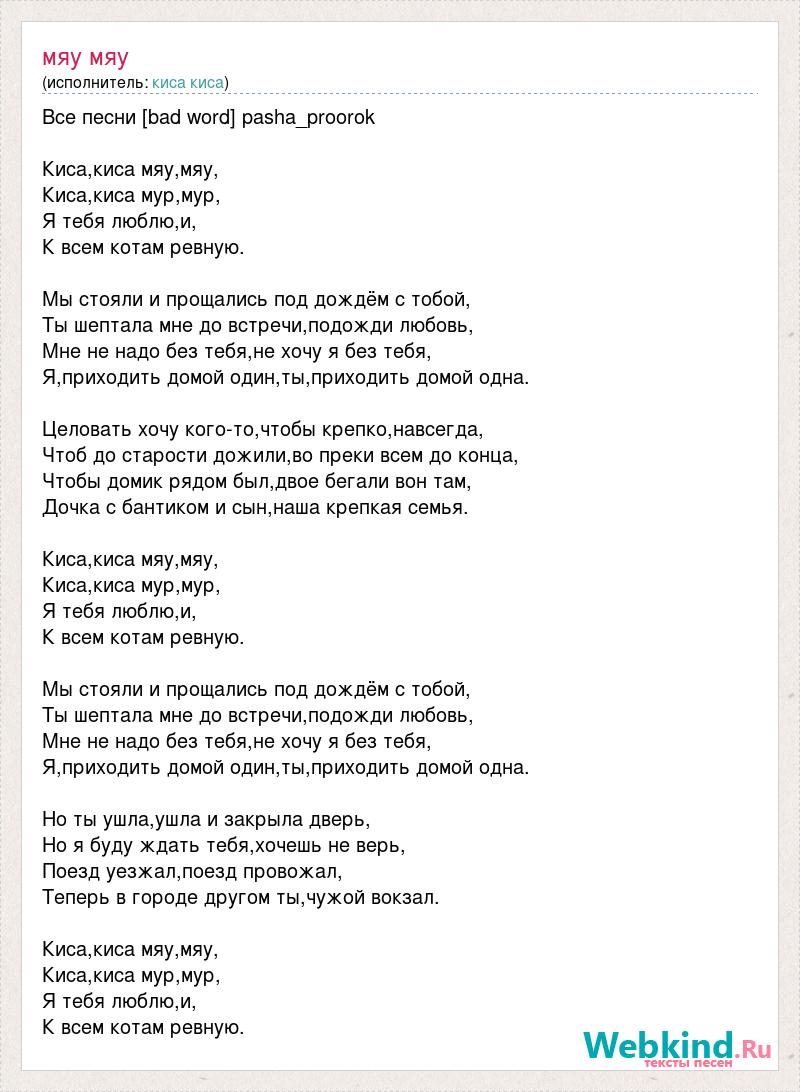 Все песни [bad word] pasha_proorok Киса,киса мяу,мяу, Киса,киса мур,мур, Я тебя люблю,и, К всем котам ревную. Мы стояли и прощались под дождём с тобой, Ты шептала мне до встречи,подожди любовь, Мне не надо без тебя,не хочу я без тебя, Я,приходить домой один,ты,приходить домой одна. Целовать хочу кого-то,чтобы крепко,навсегда, Чтоб до старости дожили,во преки всем до конца, Чтобы домик рядом был,двое бегали вон там, Дочка с бантиком и сын,наша крепкая семья. Киса,киса мяу,мяу, Киса,киса мур,мур, Я тебя люблю,и, К всем котам ревную. Мы стояли и прощались под дождём с тобой, Ты шептала мне до встречи,подожди любовь, Мне не надо без тебя,не хочу я без тебя, Я,приходить домой один,ты,приходить домой одна. Но ты ушла,ушла и закрыла дверь, Но я буду ждать тебя,хочешь не верь, Поезд уезжал,поезд провожал, Теперь в городе другом ты,чужой вокзал. Киса,киса мяу,мяу, Киса,киса мур,мур, Я тебя люблю,и, К всем котам ревную.