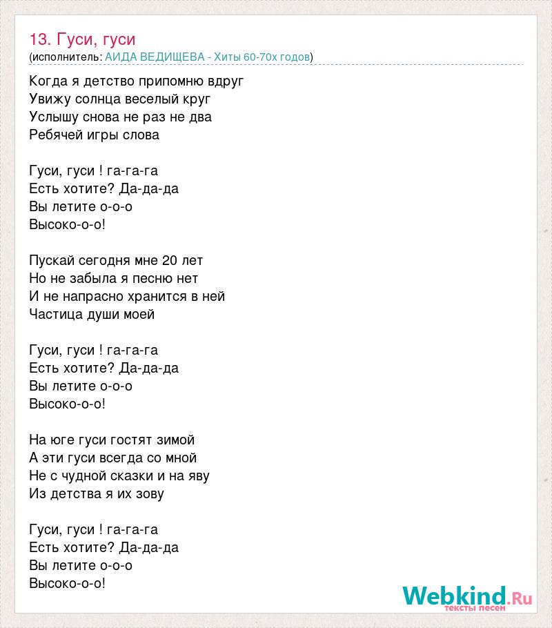 Когда я детство припомню вдруг Увижу солнца веселый круг Услышу снова не раз не два Ребячей игры слова Гуси, гуси ! га-га-га Есть хотите? Да-да-да Вы летите о-о-о Высоко-о-о! Пускай сегодня мне 20 лет Но не забыла я песню нет И не напрасно хранится в ней Частица души моей Гуси, гуси ! га-га-га Есть хотите? Да-да-да Вы летите о-о-о Высоко-о-о! На юге гуси гостят зимой А эти гуси всегда со мной Не с чудной сказки и на яву Из детства я их зову Гуси, гуси ! га-га-га Есть хотите? Да-да-да Вы летите о-о-о Высоко-о-о!