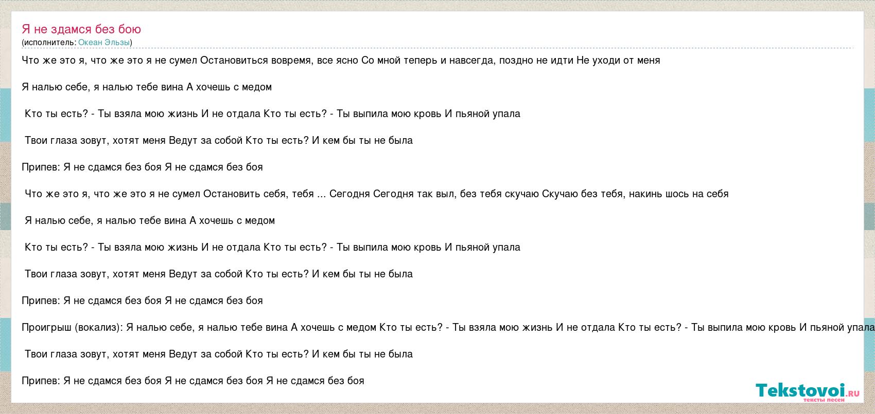 Что же это я, что же это я не сумел Остановиться вовремя, все ясно Со мной теперь и навсегда, поздно не идти Не уходи от меня Я налью себе, я налью тебе вина А хочешь с медом Кто ты есть? - Ты взяла мою жизнь И не отдала Кто ты есть? - Ты выпила мою кровь И пьяной упала Твои глаза зовут, хотят меня Ведут за собой Кто ты есть? И кем бы ты не была Припев: Я не сдамся без боя Я не сдамся без боя Что же это я, что же это я не сумел Остановить себя, тебя ... Сегодня Сегодня так выл, без тебя скучаю Скучаю без тебя, накинь шось на себя Я налью себе, я налью тебе вина А хочешь с медом Кто ты есть? - Ты взяла мою жизнь И не отдала Кто ты есть? - Ты выпила мою кровь И пьяной упала Твои глаза зовут, хотят меня Ведут за собой Кто ты есть? И кем бы ты не была Припев: Я не сдамся без боя Я не сдамся без боя Проигрыш (вокализ): Я налью себе, я налью тебе вина А хочешь с медом Кто ты есть? - Ты взяла мою жизнь И не отдала Кто ты есть? - Ты выпила мою кровь И пьяной упала Твои глаза зовут, хотят меня Ведут за собой Кто ты есть? И кем бы ты не была Припев: Я не сдамся без боя Я не сдамся без боя Я не сдамся без боя