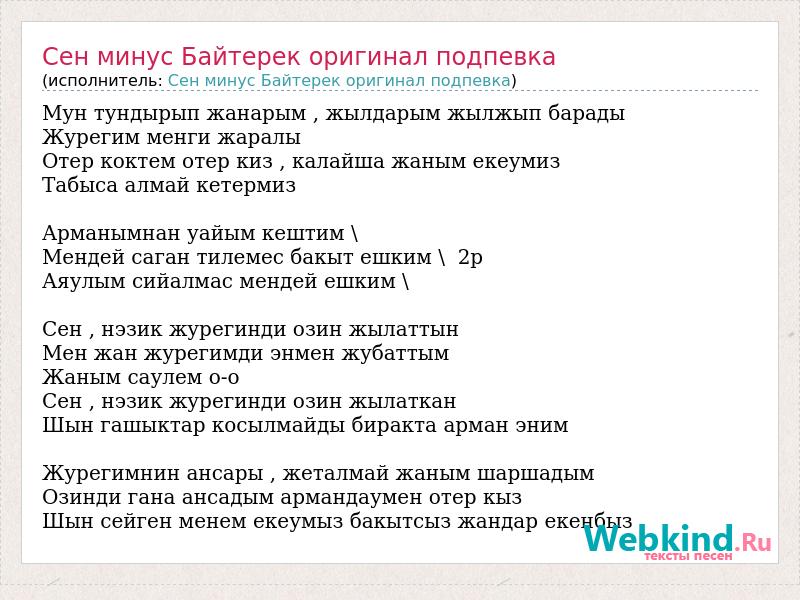 Мун тундырып жанарым , жылдарым жылжып барады Журегим менги жаралы Отер коктем отер киз , калайша жаным екеумиз Табыса алмай кетермиз Арманымнан уайым кештим \ Мендей саган тилемес бакыт ешким \ 2р Аяулым сийалмас мендей ешким \ Сен , нэзик журегинди озин жылаттын Мен жан журегимди энмен жубаттым Жаным саулем о-о Сен , нэзик журегинди озин жылаткан Шын гашыктар косылмайды биракта арман эним Журегимнин ансары , жеталмай жаным шаршадым Озинди гана ансадым армандаумен отер кыз Шын сейген менем екеумыз бакытсыз жандар екенбыз