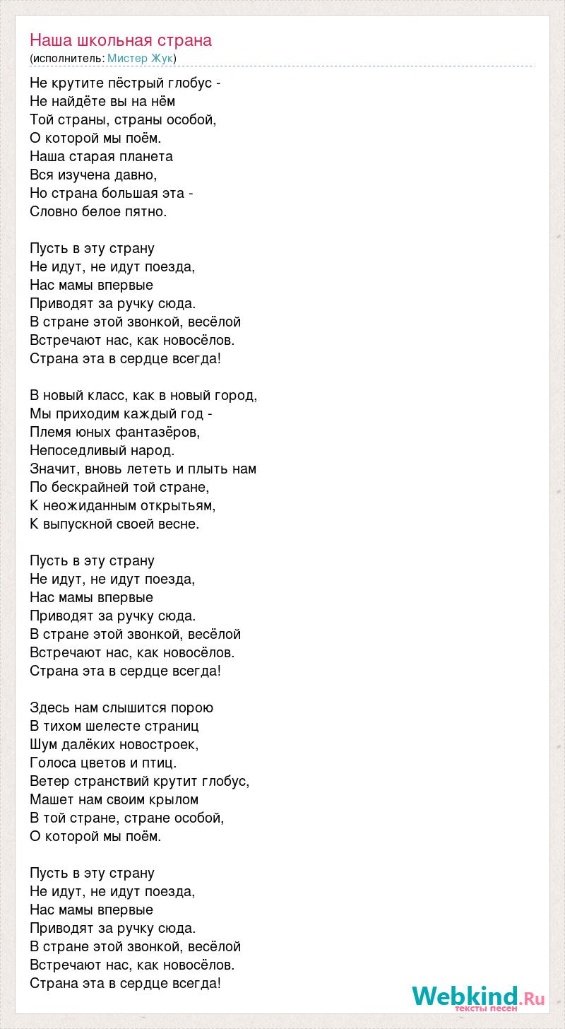 Не крутите пёстрый глобус - Не найдёте вы на нём Той страны, страны особой, О которой мы поём. Наша старая планета Вся изучена давно, Но страна большая эта - Словно белое пятно. Пусть в эту страну Не идут, не идут поезда, Нас мамы впервые Приводят за ручку сюда. В стране этой звонкой, весёлой Встречают нас, как новосёлов. Страна эта в сердце всегда! В новый класс, как в новый город, Мы приходим каждый год - Племя юных фантазёров, Непоседливый народ. Значит, вновь лететь и плыть нам По бескрайней той стране, К неожиданным открытьям, К выпускной своей весне. Пусть в эту страну Не идут, не идут поезда, Нас мамы впервые Приводят за ручку сюда. В стране этой звонкой, весёлой Встречают нас, как новосёлов. Страна эта в сердце всегда! Здесь нам слышится порою В тихом шелесте страниц Шум далёких новостроек, Голоса цветов и птиц. Ветер странствий крутит глобус, Машет нам своим крылом В той стране, стране особой, О которой мы поём. Пусть в эту страну Не идут, не идут поезда, Нас мамы впервые Приводят за ручку сюда. В стране этой звонкой, весёлой Встречают нас, как новосёлов. Страна эта в сердце всегда!