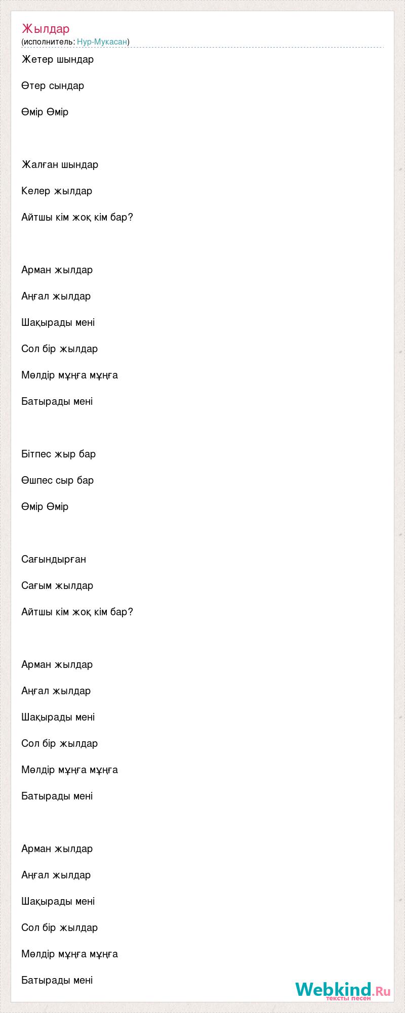 Жетер шындар Өтер сындар Өмір Өмір Жалған шындар Келер жылдар Айтшы кім жоқ кім бар? Арман жылдар Аңғал жылдар Шақырады мені Сол бір жылдар Мөлдір мұңға мұңға Батырады мені Бітпес жыр бар Өшпес сыр бар Өмір Өмір Сағындырған Сағым жылдар Айтшы кім жоқ кім бар? Арман жылдар Аңғал жылдар Шақырады мені Сол бір жылдар Мөлдір мұңға мұңға Батырады мені Арман жылдар Аңғал жылдар Шақырады мені Сол бір жылдар Мөлдір мұңға мұңға Батырады мені