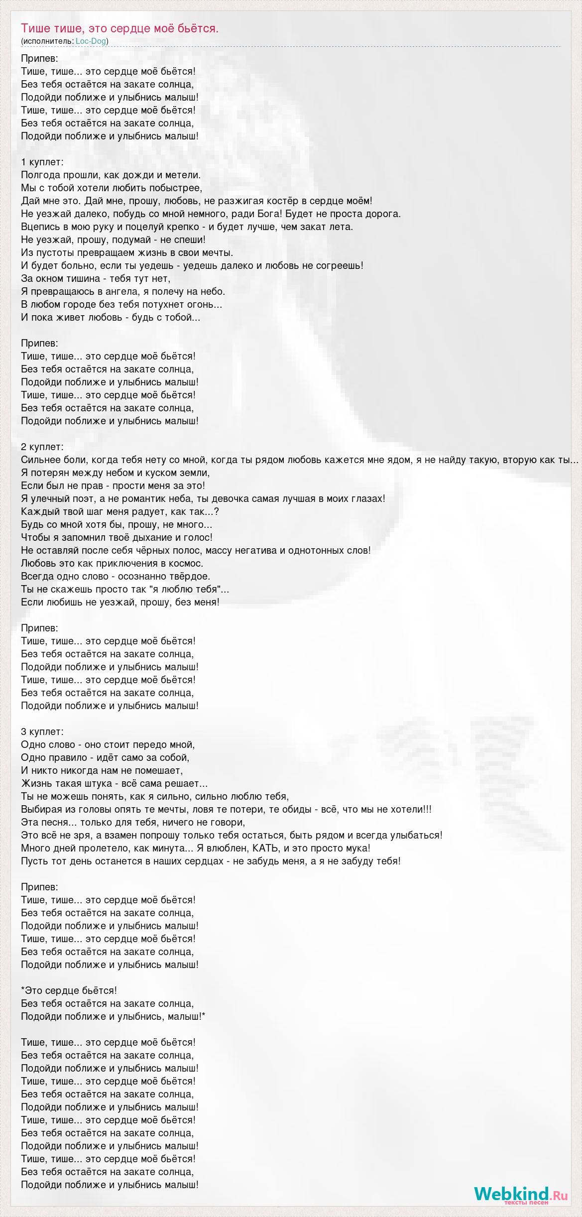 Припев: Тише, тише... это сердце моё бьётся! Без тебя остаётся на закате солнца, Подойди поближе и улыбнись малыш! Тише, тише... это сердце моё бьётся! Без тебя остаётся на закате солнца, Подойди поближе и улыбнись малыш! 1 куплет: Полгода прошли, как дожди и метели. Мы с тобой хотели любить побыстрее, Дай мне это. Дай мне, прошу, любовь, не разжигая костёр в сердце моём! Не уезжай далеко, побудь со мной немного, ради Бога! Будет не проста дорога. Вцепись в мою руку и поцелуй крепко - и будет лучше, чем закат лета. Не уезжай, прошу, подумай - не спеши! Из пустоты превращаем жизнь в свои мечты. И будет больно, если ты уедешь - уедешь далеко и любовь не согреешь! За окном тишина - тебя тут нет, Я превращаюсь в ангела, я полечу на небо. В любом городе без тебя потухнет огонь... И пока живет любовь - будь с тобой... Припев: Тише, тише... это сердце моё бьётся! Без тебя остаётся на закате солнца, Подойди поближе и улыбнись малыш! Тише, тише... это сердце моё бьётся! Без тебя остаётся на закате солнца, Подойди поближе и улыбнись малыш! 2 куплет: Сильнее боли, когда тебя нету со мной, когда ты рядом любовь кажется мне ядом, я не найду такую, вторую как ты... Я потерян между небом и куском земли, Если был не прав - прости меня за это! Я улечный поэт, а не романтик неба, ты девочка самая лучшая в моих глазах! Каждый твой шаг меня радует, как так...? Будь со мной хотя бы, прошу, не много... Чтобы я запомнил твоё дыхание и голос! Не оставляй после себя чёрных полос, массу негатива и однотонных слов! Любовь это как приключения в космос. Всегда одно слово - осознанно твёрдое. Ты не скажешь просто так "я люблю тебя"... Если любишь не уезжай, прошу, без меня! Припев: Тише, тише... это сердце моё бьётся! Без тебя остаётся на закате солнца, Подойди поближе и улыбнись малыш! Тише, тише... это сердце моё бьётся! Без тебя остаётся на закате солнца, Подойди поближе и улыбнись малыш! 3 куплет: Одно слово - оно стоит передо мной, Одно правило - идёт само за собой, И никто никогда нам не помешает, Жизнь такая штука - всё сама решает... Ты не можешь понять, как я сильно, сильно люблю тебя, Выбирая из головы опять те мечты, ловя те потери, те обиды - всё, что мы не хотели!!! Эта песня... только для тебя, ничего не говори, Это всё не зря, а взамен попрошу только тебя остаться, быть рядом и всегда улыбаться! Много дней пролетело, как минута... Я влюблен, КАТЬ, и это просто мука! Пусть тот день останется в наших сердцах - не забудь меня, а я не забуду тебя! Припев: Тише, тише... это сердце моё бьётся! Без тебя остаётся на закате солнца, Подойди поближе и улыбнись малыш! Тише, тише... это сердце моё бьётся! Без тебя остаётся на закате солнца, Подойди поближе и улыбнись малыш! *Это сердце бьётся! Без тебя остаётся на закате солнца, Подойди поближе и улыбнись, малыш!* Тише, тише... это сердце моё бьётся! Без тебя остаётся на закате солнца, Подойди поближе и улыбнись малыш! Тише, тише... это сердце моё бьётся! Без тебя остаётся на закате солнца, Подойди поближе и улыбнись малыш! Тише, тише... это сердце моё бьётся! Без тебя остаётся на закате солнца, Подойди поближе и улыбнись малыш! Тише, тише... это сердце моё бьётся! Без тебя остаётся на закате солнца, Подойди поближе и улыбнись малыш!