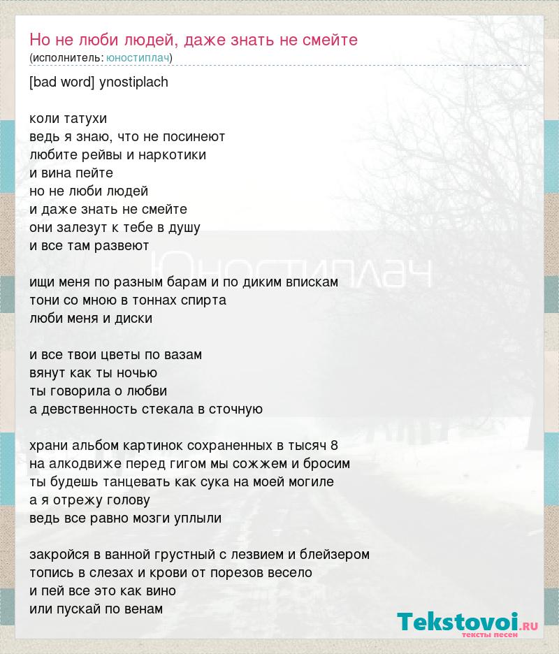 [bad word] ynostiplach коли татухи ведь я знаю, что не посинеют любите рейвы и наркотики и вина пейте но не люби людей и даже знать не смейте они залезут к тебе в душу и все там развеют ищи меня по разным барам и по диким впискам тони со мною в тоннах спирта люби меня и диски и все твои цветы по вазам вянут как ты ночью ты говорила о любви а девственность стекала в сточную храни альбом картинок сохраненных в тысяч 8 на алкодвиже перед гигом мы сожжем и бросим ты будешь танцевать как сука на моей могиле а я отрежу голову ведь все равно мозги уплыли закройся в ванной грустный с лезвием и блейзером топись в слезах и крови от порезов весело и пей все это как вино или пускай по венам