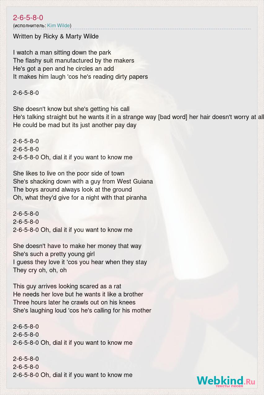 Written by Ricky & Marty Wilde I watch a man sitting down the park The flashy suit manufactured by the makers He's got a pen and he circles an add It makes him laugh 'cos he's reading dirty papers 2-6-5-8-0 She doesn't know but she's getting his call He's talking straight but he wants it in a strange way [bad word] her hair doesn't worry at all He could be mad but its just another pay day 2-6-5-8-0 2-6-5-8-0 2-6-5-8-0 Oh, dial it if you want to know me She likes to live on the poor side of town She's shacking down with a guy from West Guiana The boys around always look at the ground Oh, what they'd give for a night with that piranha 2-6-5-8-0 2-6-5-8-0 2-6-5-8-0 Oh, dial it if you want to know me She doesn't have to make her money that way She's such a pretty young girl I guess they love it 'cos you hear when they stay They cry oh, oh, oh This guy arrives looking scared as a rat He needs her love but he wants it like a brother Three hours later he crawls out on his knees She's laughing loud 'cos he's calling for his mother 2-6-5-8-0 2-6-5-8-0 2-6-5-8-0 Oh, dial it if you want to know me 2-6-5-8-0 2-6-5-8-0 2-6-5-8-0 Oh, dial it if you want to know me
