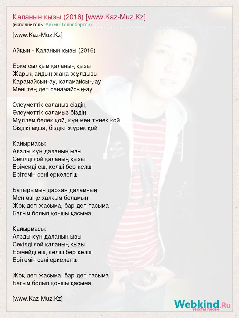 [www.Kaz-Muz.Kz] Айқын - Қаланың қызы (2016) Ерке сылқым қаланың қызы Жарық айдың жаңа жұлдызы Қарамайсың-ау, қаламайсың-ау Мені тең деп санамайсың-ау Әлеуметтік салаңыз сіздің Әлеуметтік саламыз біздің Мүлдем бөлек қой, күн мен түнек қой Сіздікі ақша, біздікі жүрек қой Қайырмасы: Аязды күн даланың ызы Секілді ғой қаланың қызы Ерімейді еш, келші бер келші Ерітемін сені еркелегіш Батырымын дархан даламның Мен өзіңе халқым боламын Жоқ деп жасыма, бар деп тасыма Бағым болып қоншы қасыма Қайырмасы: Аязды күн даланың ызы Секілді ғой қаланың қызы Ерімейді еш, келші бер келші Ерітемін сені еркелегіш Жоқ деп жасыма, бар деп тасыма Бағым болып қоншы қасыма [www.Kaz-Muz.Kz]