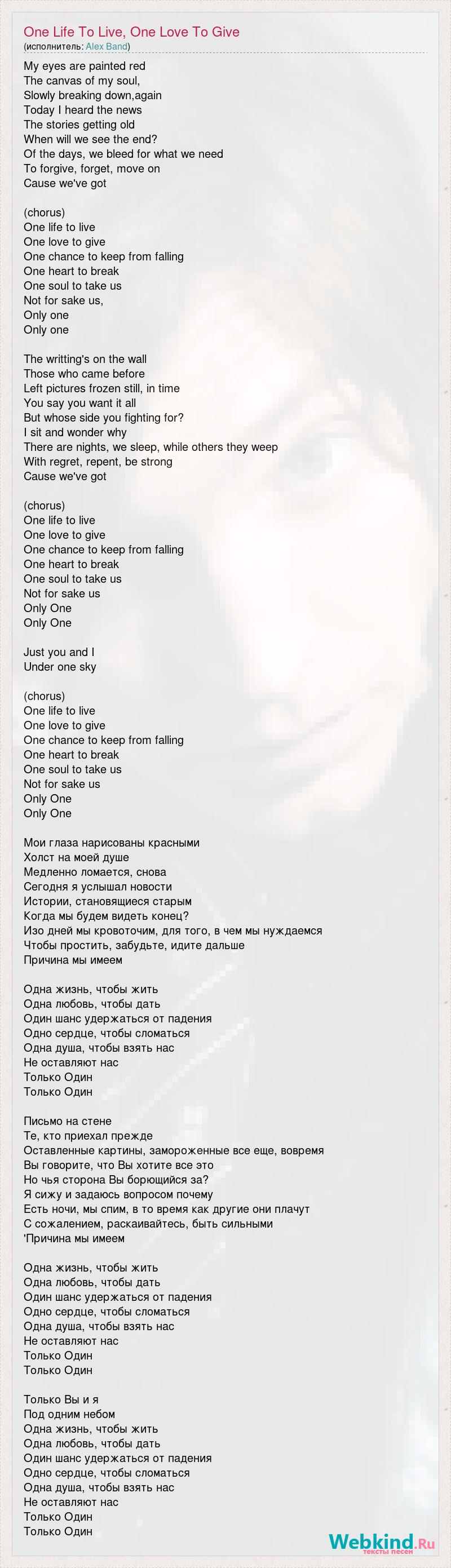 My eyes are painted red The canvas of my soul, Slowly breaking down,again Today I heard the news The stories getting old When will we see the end? Of the days, we bleed for what we need To forgive, forget, move on Cause we've got (chorus) One life to live One love to give One chance to keep from falling One heart to break One soul to take us Not for sake us, Only one Only one The writting's on the wall Those who came before Left pictures frozen still, in time You say you want it all But whose side you fighting for? I sit and wonder why There are nights, we sleep, while others they weep With regret, repent, be strong Cause we've got (chorus) One life to live One love to give One chance to keep from falling One heart to break One soul to take us Not for sake us Only One Only One Just you and I Under one sky (chorus) One life to live One love to give One chance to keep from falling One heart to break One soul to take us Not for sake us Only One Only One Мои глаза нарисованы красными Холст на моей душе Медленно ломается, снова Сегодня я услышал новости Истории, становящиеся старым Когда мы будем видеть конец? Изо дней мы кровоточим, для того, в чем мы нуждаемся Чтобы простить, забудьте, идите дальше Причина мы имеем Одна жизнь, чтобы жить Одна любовь, чтобы дать Один шанс удержаться от падения Одно сердце, чтобы сломаться Одна душа, чтобы взять нас Не оставляют нас Только Один Только Один Письмо на стене Те, кто приехал прежде Оставленные картины, замороженные все еще, вовремя Вы говорите, что Вы хотите все это Но чья сторона Вы борющийся за? Я сижу и задаюсь вопросом почему Есть ночи, мы спим, в то время как другие они плачут С сожалением, раскаивайтесь, быть сильными 'Причина мы имеем Одна жизнь, чтобы жить Одна любовь, чтобы дать Один шанс удержаться от падения Одно сердце, чтобы сломаться Одна душа, чтобы взять нас Не оставляют нас Только Один Только Один Только Вы и я Под одним небом Одна жизнь, чтобы жить Одна любовь, чтобы дать Один шанс удержаться от падения Одно сердце, чтобы сломаться Одна душа, чтобы взять нас Не оставляют нас Только Один Только Один