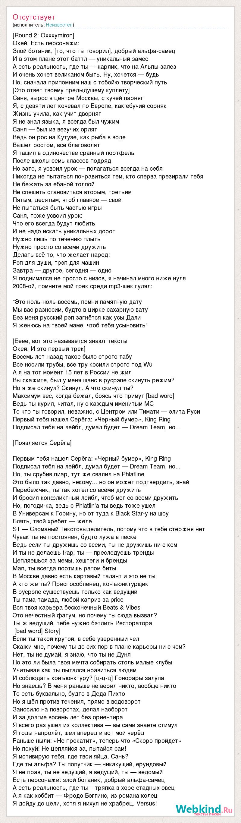[Round 2: Oxxxymiron] Окей. Есть персонажи: Злой ботаник, [то, что ты говорил], добрый альфа-самец И в этом плане этот баттл — уникальный замес А есть реальность, где ты — карлик, что на Альпы залез И очень хочет великаном быть. Ну, хочется — будь Но, сначала припомним наш с тобойю творческий путь [Это ответ твоему предыдущему куплету] Саня, вырос в центре Москвы, с кучей парняг Я, с девяти лет кочевал по Европе, как ебучий сорняк Жизнь учила, как учит дворняг Я не знал языка, я всегда был чужим Саня — был из везучих орлят Ведь он рос на Кутузе, как рыба в воде Вышел ростом, все благоволят Я тащил в одиночестве сранный портфель После школы семь классов подряд Но зато, я усвоил урок — полагаться всегда на себя Никогда не пытаться понравиться тем, кто сперва презирали тебя Не бежать за ебаной толпой Не спешить становиться вторым, третьим Пятым, десятым, чтоб главное — свой Не пытаться быть частью игры Саня, тоже усвоил урок: Что его всегда будут любить И не надо искать уникальных дорог Нужно лишь по течению плыть Нужно просто со всеми дружить Делать всё то, что желает народ: Рэп для души, трэп для машин Завтра — другое, сегодня — одно Я поднимался не просто с низов, я начинал много ниже нуля 2008-ой, помните мой трек среди mp3-шек гулял: "Это ноль-ноль-восемь, помни памятную дату Мы вас разносим, будто в цирке сахарную вату Без меня русский рэп загнётся как усы Дали Я женюсь на твоей маме, чтоб тебя усыновить" [Ееее, вот это называется знают тексты Окей. И это первый трек] Восемь лет назад такое было строго табу Все носили трубы, все тру косили строго под Wu А я на тот момент 15 лет в России не жил Вы скажите, был у меня шанс в русрэпе скинуть режим? Но я же скинул? Скинул. А что скинул ты? Максимум вес, когда бежал, боясь что примут [bad word] Ведь ты курил, читал, ну с каждым именитым МС То что ты говорил, неважно, с Центром или Тимати — элита Руси Первый тебя нашел Серёга: «Черный бумер», King Ring Подписал тебя на лейбл, думал будет — Dream Team, но... [Появляется Серёга] Первым тебя нашел Серёга: «Черный бумер», King Ring Подписал тебя на лейбл, думал будет — Dream Team, но... Но, ты срубив пиар, тут же свалил на Phlatline Это было так давно, некому... но он может подтвердить, знай Перебежчик, ты так хотел со всеми дружить И бросил конфликтный лейбл, чтоб мог со всеми дружить Но, погоди-ка, ведь с Phlatlin'а ты ведь тоже ушел В Универсам к Горину, но от туда к Black Star-у на шоу Блять, твой хребет — желе ST — Сломаный Текстовыделитель, потому что в тебе стержня нет Чувак ты не постоянен, будто лужа в песке Ведь если ты дружишь со всеми, ты не дружишь ни с кем И ты не делаешь trap, ты — преследуешь тренды Цепляешься за мемы, хештеги и бренды Man, ты всегда портишь рэпом биты В Москве давно есть картавый талант и это не ты А кто же ты? Приспособленец, конъюнктурщик В русрэпе существуешь только как ведущий Ты тама-тамада, любой каприз за price Вся твоя карьера бесконечный Beats & Vibes Это нечестный фатум, но почему ты сюда вызвал? Ты ж ведущий, тебе нужно бэтлить Ресторатора [bad word] Story] Если ты такой крутой, в себе уверенный чел Скажи мне, почему ты до сих пор в плане карьеры ни с чем? Нет, ты не думай, я знаю, что ты не Дуня Но это ли была твоя мечта собирать столь малые клубы Учитывая как ты пытался нравиться людям И соблюдать конъюнктуру? [ц-ц-ц] Гонорары залупа Но знаешь? В меня раньше не верил никто, вообще никто То есть буквально, будто в Деда Пихто 