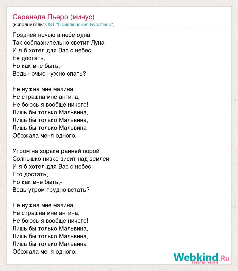 Поздней ночью в небе одна Так соблазнительно светит Луна И я б хотел для Вас с небес Ее достать, Но как мне быть,- Ведь ночью нужно спать? Не нужна мне малина, Не страшна мне ангина, Не боюсь я вообще ничего! Лишь бы только Мальвина, Лишь бы только Мальвина, Лишь бы только Мальвина Обожала меня одного. Утром на зорьке ранней порой Солнышко низко висит над землей И я б хотел для Вас с небес Его достать, Но как мне быть,- Ведь утром трудно встать? Не нужна мне малина, Не страшна мне ангина, Не боюсь я вообще ничего! Лишь бы только Мальвина, Лишь бы только Мальвина, Лишь бы только Мальвина Обожала меня одного.