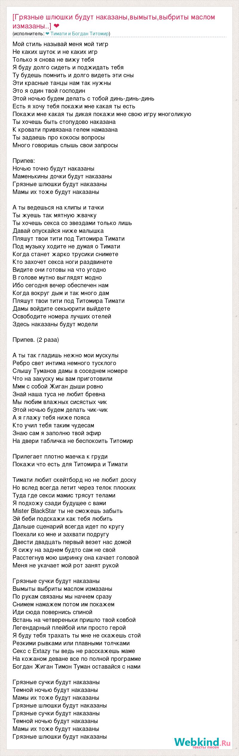 Мой стиль называй меня мой тигр Не каких шуток и не каких игр Только я снова не вижу тебя Я буду долго сидеть и поджидать тебя Ту будешь помнить и долго видеть эти сны Эти красные танцы нам так нужны Это я один твой господин Этой ночью будем делать с тобой динь-динь-динь Есть я хочу тебя покажи мне какая ты есть Покажи мне какая ты дикая покажи мне свою игру многоликую Ты хочешь быть стопудово наказана К кровати привязана гелем намазана Ты задаешь про кокосы вопросы Много говоришь слышь свои запросы Припев: Ночью точно будут наказаны Маменькины дочки будут наказаны Грязные шлюшки будут наказаны Мамы их тоже будут наказаны А ты ведешься на клипы и тачки Ты жуешь так мятную жвачку Ты хочешь секса со звездами только лишь Давай опускайся ниже малышка Пляшут твои тити под Титомира Тимати Под музыку ходите не думая о Тимати Когда станет жарко трусики снимете Кто захочет секса ноги раздвинете Видите они готовы на что угодно В голове мутно выглядят модно Ибо сегодня вечер обеспечен нам Когда вокруг дым и так много дам Пляшут твои тити под Титомира Тимати Дамы войдите секьюрити выйдете Освободите номера лучших отелей Здесь наказаны будут модели Припев. (2 раза) А ты так гладишь нежно мои мускулы Ребро свет интима немного тусклого Слышу Туманов дамы в соседнем номере Что на закуску мы вам приготовили Ммм с собой Жиган дыши ровно Знай наша туса не любит бревна Мы любим влажных сисястых чик Этой ночью будем делать чик-чик А я глажу тебя ниже пояса Кто учил тебя таким чудесам Знаю сам я заполню твой эфир На двери табличка не беспокоить Титомир Прилегает плотно маечка к груди Покажи что есть для Титомира и Тимати Тимати любит скейтборд но не любит доску Но вслед всегда летит через телок плоских Туда где секси мамис трясут телами Я подхожу сзади будущее с вами Mister BlackStar ты не сможешь забыть Эй беби подскажи как тебя любить Дальше сценарий всегда идет по кругу Поехали ко мне и захвати подругу Двести двадцать первый везет нас домой Я сижу на заднем будто сам не свой Расстегнув мою ширинку она качает головой Меня не укачает мой рот занят рукой Грязные сучки будут наказаны Вымыты выбриты маслом измазаны По рукам связаны мы начнем сразу Снимем намажем потом им покажем Иди сюда повернись спиной Встань на четвереньки пришло твой ковбой Легендарный плейбой или просто герой Я буду тебя трахать ты мне не скажешь стой Резкими рывками или плавными толчками Секс с Extazy ты ведь не расскажешь маме На кожаном деване все по полной программе Богдан Жиган Тимон Туман оставайся с нами Грязные сучки будут наказаны Темной ночью будут наказаны Мамы их тоже будут наказаны Грязные шлюшки будут наказаны Грязные сучки будут наказаны Темной ночью будут наказаны Мамы их тоже будут наказаны Грязные шлюшки будут наказаны