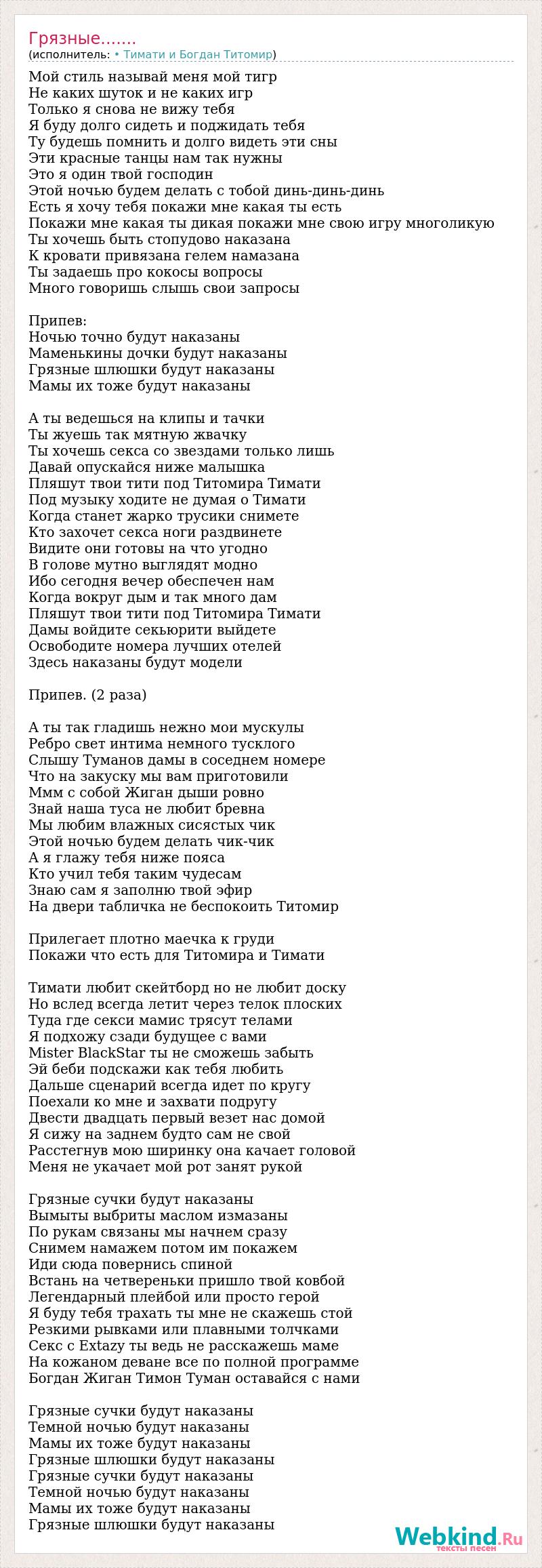 Мой стиль называй меня мой тигр Не каких шуток и не каких игр Только я снова не вижу тебя Я буду долго сидеть и поджидать тебя Ту будешь помнить и долго видеть эти сны Эти красные танцы нам так нужны Это я один твой господин Этой ночью будем делать с тобой динь-динь-динь Есть я хочу тебя покажи мне какая ты есть Покажи мне какая ты дикая покажи мне свою игру многоликую Ты хочешь быть стопудово наказана К кровати привязана гелем намазана Ты задаешь про кокосы вопросы Много говоришь слышь свои запросы Припев: Ночью точно будут наказаны Маменькины дочки будут наказаны Грязные шлюшки будут наказаны Мамы их тоже будут наказаны А ты ведешься на клипы и тачки Ты жуешь так мятную жвачку Ты хочешь секса со звездами только лишь Давай опускайся ниже малышка Пляшут твои тити под Титомира Тимати Под музыку ходите не думая о Тимати Когда станет жарко трусики снимете Кто захочет секса ноги раздвинете Видите они готовы на что угодно В голове мутно выглядят модно Ибо сегодня вечер обеспечен нам Когда вокруг дым и так много дам Пляшут твои тити под Титомира Тимати Дамы войдите секьюрити выйдете Освободите номера лучших отелей Здесь наказаны будут модели Припев. (2 раза) А ты так гладишь нежно мои мускулы Ребро свет интима немного тусклого Слышу Туманов дамы в соседнем номере Что на закуску мы вам приготовили Ммм с собой Жиган дыши ровно Знай наша туса не любит бревна Мы любим влажных сисястых чик Этой ночью будем делать чик-чик А я глажу тебя ниже пояса Кто учил тебя таким чудесам Знаю сам я заполню твой эфир На двери табличка не беспокоить Титомир Прилегает плотно маечка к груди Покажи что есть для Титомира и Тимати Тимати любит скейтборд но не любит доску Но вслед всегда летит через телок плоских Туда где секси мамис трясут телами Я подхожу сзади будущее с вами Mister BlackStar ты не сможешь забыть Эй беби подскажи как тебя любить Дальше сценарий всегда идет по кругу Поехали ко мне и захвати подругу Двести двадцать первый везет нас домой Я сижу на заднем будто сам не свой Расстегнув мою ширинку она качает головой Меня не укачает мой рот занят рукой Грязные сучки будут наказаны Вымыты выбриты маслом измазаны По рукам связаны мы начнем сразу Снимем намажем потом им покажем Иди сюда повернись спиной Встань на четвереньки пришло твой ковбой Легендарный плейбой или просто герой Я буду тебя трахать ты мне не скажешь стой Резкими рывками или плавными толчками Секс с Extazy ты ведь не расскажешь маме На кожаном деване все по полной программе Богдан Жиган Тимон Туман оставайся с нами Грязные сучки будут наказаны Темной ночью будут наказаны Мамы их тоже будут наказаны Грязные шлюшки будут наказаны Грязные сучки будут наказаны Темной ночью будут наказаны Мамы их тоже будут наказаны Грязные шлюшки будут наказаны