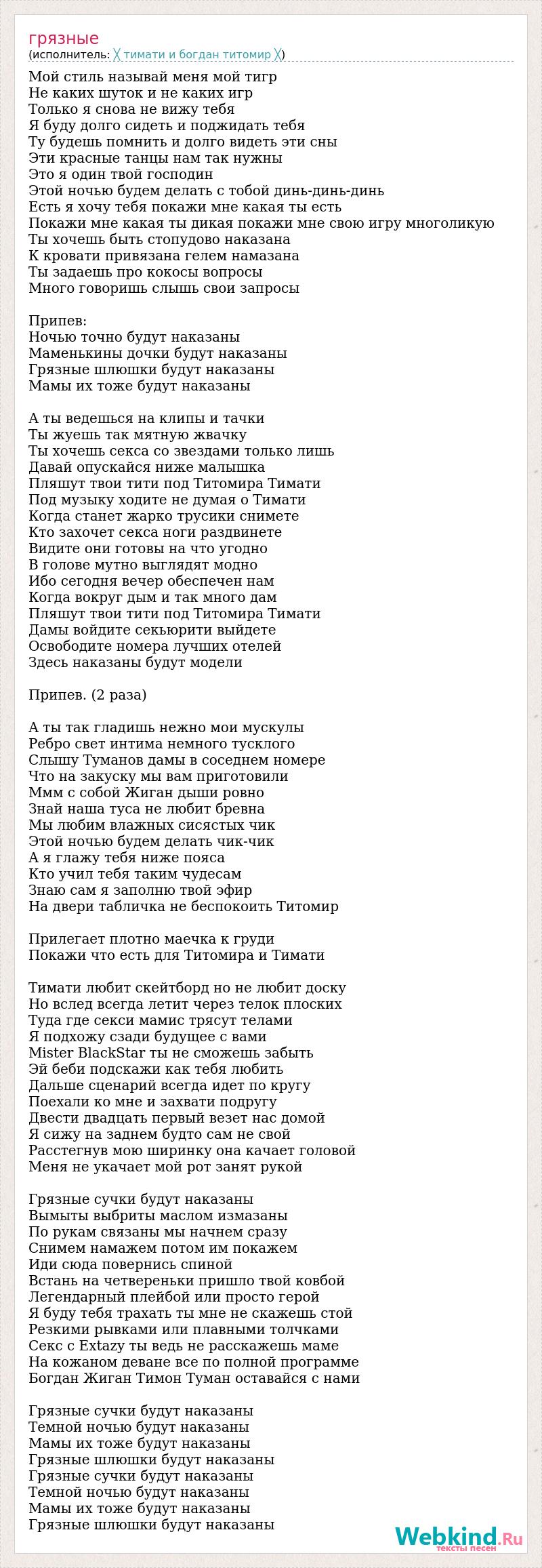 Мой стиль называй меня мой тигр Не каких шуток и не каких игр Только я снова не вижу тебя Я буду долго сидеть и поджидать тебя Ту будешь помнить и долго видеть эти сны Эти красные танцы нам так нужны Это я один твой господин Этой ночью будем делать с тобой динь-динь-динь Есть я хочу тебя покажи мне какая ты есть Покажи мне какая ты дикая покажи мне свою игру многоликую Ты хочешь быть стопудово наказана К кровати привязана гелем намазана Ты задаешь про кокосы вопросы Много говоришь слышь свои запросы Припев: Ночью точно будут наказаны Маменькины дочки будут наказаны Грязные шлюшки будут наказаны Мамы их тоже будут наказаны А ты ведешься на клипы и тачки Ты жуешь так мятную жвачку Ты хочешь секса со звездами только лишь Давай опускайся ниже малышка Пляшут твои тити под Титомира Тимати Под музыку ходите не думая о Тимати Когда станет жарко трусики снимете Кто захочет секса ноги раздвинете Видите они готовы на что угодно В голове мутно выглядят модно Ибо сегодня вечер обеспечен нам Когда вокруг дым и так много дам Пляшут твои тити под Титомира Тимати Дамы войдите секьюрити выйдете Освободите номера лучших отелей Здесь наказаны будут модели Припев. (2 раза) А ты так гладишь нежно мои мускулы Ребро свет интима немного тусклого Слышу Туманов дамы в соседнем номере Что на закуску мы вам приготовили Ммм с собой Жиган дыши ровно Знай наша туса не любит бревна Мы любим влажных сисястых чик Этой ночью будем делать чик-чик А я глажу тебя ниже пояса Кто учил тебя таким чудесам Знаю сам я заполню твой эфир На двери табличка не беспокоить Титомир Прилегает плотно маечка к груди Покажи что есть для Титомира и Тимати Тимати любит скейтборд но не любит доску Но вслед всегда летит через телок плоских Туда где секси мамис трясут телами Я подхожу сзади будущее с вами Mister BlackStar ты не сможешь забыть Эй беби подскажи как тебя любить Дальше сценарий всегда идет по кругу Поехали ко мне и захвати подругу Двести двадцать первый везет нас домой Я сижу на заднем будто сам не свой Расстегнув мою ширинку она качает головой Меня не укачает мой рот занят рукой Грязные сучки будут наказаны Вымыты выбриты маслом измазаны По рукам связаны мы начнем сразу Снимем намажем потом им покажем Иди сюда повернись спиной Встань на четвереньки пришло твой ковбой Легендарный плейбой или просто герой Я буду тебя трахать ты мне не скажешь стой Резкими рывками или плавными толчками Секс с Extazy ты ведь не расскажешь маме На кожаном деване все по полной программе Богдан Жиган Тимон Туман оставайся с нами Грязные сучки будут наказаны Темной ночью будут наказаны Мамы их тоже будут наказаны Грязные шлюшки будут наказаны Грязные сучки будут наказаны Темной ночью будут наказаны Мамы их тоже будут наказаны Грязные шлюшки будут наказаны