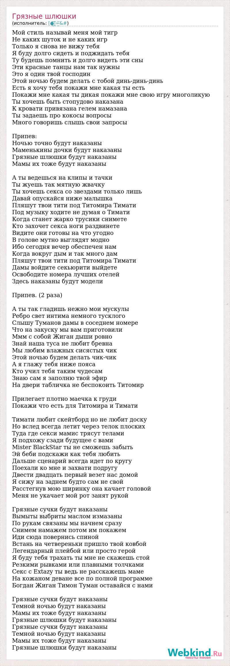 Мой стиль называй меня мой тигр Не каких шуток и не каких игр Только я снова не вижу тебя Я буду долго сидеть и поджидать тебя Ту будешь помнить и долго видеть эти сны Эти красные танцы нам так нужны Это я один твой господин Этой ночью будем делать с тобой динь-динь-динь Есть я хочу тебя покажи мне какая ты есть Покажи мне какая ты дикая покажи мне свою игру многоликую Ты хочешь быть стопудово наказана К кровати привязана гелем намазана Ты задаешь про кокосы вопросы Много говоришь слышь свои запросы Припев: Ночью точно будут наказаны Маменькины дочки будут наказаны Грязные шлюшки будут наказаны Мамы их тоже будут наказаны А ты ведешься на клипы и тачки Ты жуешь так мятную жвачку Ты хочешь секса со звездами только лишь Давай опускайся ниже малышка Пляшут твои тити под Титомира Тимати Под музыку ходите не думая о Тимати Когда станет жарко трусики снимете Кто захочет секса ноги раздвинете Видите они готовы на что угодно В голове мутно выглядят модно Ибо сегодня вечер обеспечен нам Когда вокруг дым и так много дам Пляшут твои тити под Титомира Тимати Дамы войдите секьюрити выйдете Освободите номера лучших отелей Здесь наказаны будут модели Припев. (2 раза) А ты так гладишь нежно мои мускулы Ребро свет интима немного тусклого Слышу Туманов дамы в соседнем номере Что на закуску мы вам приготовили Ммм с собой Жиган дыши ровно Знай наша туса не любит бревна Мы любим влажных сисястых чик Этой ночью будем делать чик-чик А я глажу тебя ниже пояса Кто учил тебя таким чудесам Знаю сам я заполню твой эфир На двери табличка не беспокоить Титомир Прилегает плотно маечка к груди Покажи что есть для Титомира и Тимати Тимати любит скейтборд но не любит доску Но вслед всегда летит через телок плоских Туда где секси мамис трясут телами Я подхожу сзади будущее с вами Mister BlackStar ты не сможешь забыть Эй беби подскажи как тебя любить Дальше сценарий всегда идет по кругу Поехали ко мне и захвати подругу Двести двадцать первый везет нас домой Я сижу на заднем будто сам не свой Расстегнув мою ширинку она качает головой Меня не укачает мой рот занят рукой Грязные сучки будут наказаны Вымыты выбриты маслом измазаны По рукам связаны мы начнем сразу Снимем намажем потом им покажем Иди сюда повернись спиной Встань на четвереньки пришло твой ковбой Легендарный плейбой или просто герой Я буду тебя трахать ты мне не скажешь стой Резкими рывками или плавными толчками Секс с Extazy ты ведь не расскажешь маме На кожаном деване все по полной программе Богдан Жиган Тимон Туман оставайся с нами Грязные сучки будут наказаны Темной ночью будут наказаны Мамы их тоже будут наказаны Грязные шлюшки будут наказаны Грязные сучки будут наказаны Темной ночью будут наказаны Мамы их тоже будут наказаны Грязные шлюшки будут наказаны