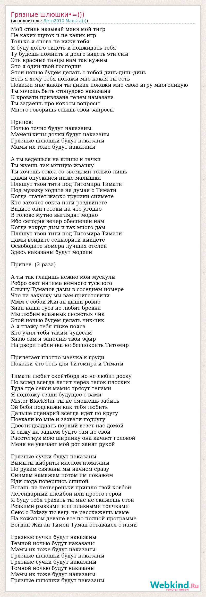 Мой стиль называй меня мой тигр Не каких шуток и не каких игр Только я снова не вижу тебя Я буду долго сидеть и поджидать тебя Ту будешь помнить и долго видеть эти сны Эти красные танцы нам так нужны Это я один твой господин Этой ночью будем делать с тобой динь-динь-динь Есть я хочу тебя покажи мне какая ты есть Покажи мне какая ты дикая покажи мне свою игру многоликую Ты хочешь быть стопудово наказана К кровати привязана гелем намазана Ты задаешь про кокосы вопросы Много говоришь слышь свои запросы Припев: Ночью точно будут наказаны Маменькины дочки будут наказаны Грязные шлюшки будут наказаны Мамы их тоже будут наказаны А ты ведешься на клипы и тачки Ты жуешь так мятную жвачку Ты хочешь секса со звездами только лишь Давай опускайся ниже малышка Пляшут твои тити под Титомира Тимати Под музыку ходите не думая о Тимати Когда станет жарко трусики снимете Кто захочет секса ноги раздвинете Видите они готовы на что угодно В голове мутно выглядят модно Ибо сегодня вечер обеспечен нам Когда вокруг дым и так много дам Пляшут твои тити под Титомира Тимати Дамы войдите секьюрити выйдете Освободите номера лучших отелей Здесь наказаны будут модели Припев. (2 раза) А ты так гладишь нежно мои мускулы Ребро свет интима немного тусклого Слышу Туманов дамы в соседнем номере Что на закуску мы вам приготовили Ммм с собой Жиган дыши ровно Знай наша туса не любит бревна Мы любим влажных сисястых чик Этой ночью будем делать чик-чик А я глажу тебя ниже пояса Кто учил тебя таким чудесам Знаю сам я заполню твой эфир На двери табличка не беспокоить Титомир Прилегает плотно маечка к груди Покажи что есть для Титомира и Тимати Тимати любит скейтборд но не любит доску Но вслед всегда летит через телок плоских Туда где секси мамис трясут телами Я подхожу сзади будущее с вами Mister BlackStar ты не сможешь забыть Эй беби подскажи как тебя любить Дальше сценарий всегда идет по кругу Поехали ко мне и захвати подругу Двести двадцать первый везет нас домой Я сижу на заднем будто сам не свой Расстегнув мою ширинку она качает головой Меня не укачает мой рот занят рукой Грязные сучки будут наказаны Вымыты выбриты маслом измазаны По рукам связаны мы начнем сразу Снимем намажем потом им покажем Иди сюда повернись спиной Встань на четвереньки пришло твой ковбой Легендарный плейбой или просто герой Я буду тебя трахать ты мне не скажешь стой Резкими рывками или плавными толчками Секс с Extazy ты ведь не расскажешь маме На кожаном деване все по полной программе Богдан Жиган Тимон Туман оставайся с нами Грязные сучки будут наказаны Темной ночью будут наказаны Мамы их тоже будут наказаны Грязные шлюшки будут наказаны Грязные сучки будут наказаны Темной ночью будут наказаны Мамы их тоже будут наказаны Грязные шлюшки будут наказаны