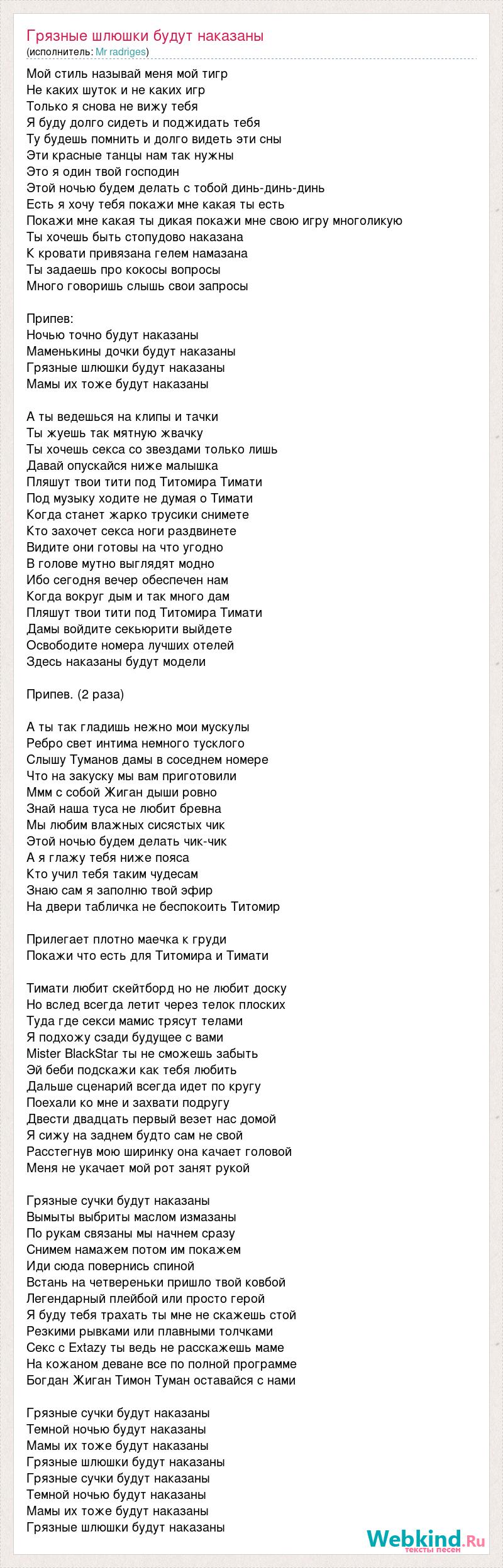 Мой стиль называй меня мой тигр Не каких шуток и не каких игр Только я снова не вижу тебя Я буду долго сидеть и поджидать тебя Ту будешь помнить и долго видеть эти сны Эти красные танцы нам так нужны Это я один твой господин Этой ночью будем делать с тобой динь-динь-динь Есть я хочу тебя покажи мне какая ты есть Покажи мне какая ты дикая покажи мне свою игру многоликую Ты хочешь быть стопудово наказана К кровати привязана гелем намазана Ты задаешь про кокосы вопросы Много говоришь слышь свои запросы Припев: Ночью точно будут наказаны Маменькины дочки будут наказаны Грязные шлюшки будут наказаны Мамы их тоже будут наказаны А ты ведешься на клипы и тачки Ты жуешь так мятную жвачку Ты хочешь секса со звездами только лишь Давай опускайся ниже малышка Пляшут твои тити под Титомира Тимати Под музыку ходите не думая о Тимати Когда станет жарко трусики снимете Кто захочет секса ноги раздвинете Видите они готовы на что угодно В голове мутно выглядят модно Ибо сегодня вечер обеспечен нам Когда вокруг дым и так много дам Пляшут твои тити под Титомира Тимати Дамы войдите секьюрити выйдете Освободите номера лучших отелей Здесь наказаны будут модели Припев. (2 раза) А ты так гладишь нежно мои мускулы Ребро свет интима немного тусклого Слышу Туманов дамы в соседнем номере Что на закуску мы вам приготовили Ммм с собой Жиган дыши ровно Знай наша туса не любит бревна Мы любим влажных сисястых чик Этой ночью будем делать чик-чик А я глажу тебя ниже пояса Кто учил тебя таким чудесам Знаю сам я заполню твой эфир На двери табличка не беспокоить Титомир Прилегает плотно маечка к груди Покажи что есть для Титомира и Тимати Тимати любит скейтборд но не любит доску Но вслед всегда летит через телок плоских Туда где секси мамис трясут телами Я подхожу сзади будущее с вами Mister BlackStar ты не сможешь забыть Эй беби подскажи как тебя любить Дальше сценарий всегда идет по кругу Поехали ко мне и захвати подругу Двести двадцать первый везет нас домой Я сижу на заднем будто сам не свой Расстегнув мою ширинку она качает головой Меня не укачает мой рот занят рукой Грязные сучки будут наказаны Вымыты выбриты маслом измазаны По рукам связаны мы начнем сразу Снимем намажем потом им покажем Иди сюда повернись спиной Встань на четвереньки пришло твой ковбой Легендарный плейбой или просто герой Я буду тебя трахать ты мне не скажешь стой Резкими рывками или плавными толчками Секс с Extazy ты ведь не расскажешь маме На кожаном деване все по полной программе Богдан Жиган Тимон Туман оставайся с нами Грязные сучки будут наказаны Темной ночью будут наказаны Мамы их тоже будут наказаны Грязные шлюшки будут наказаны Грязные сучки будут наказаны Темной ночью будут наказаны Мамы их тоже будут наказаны Грязные шлюшки будут наказаны