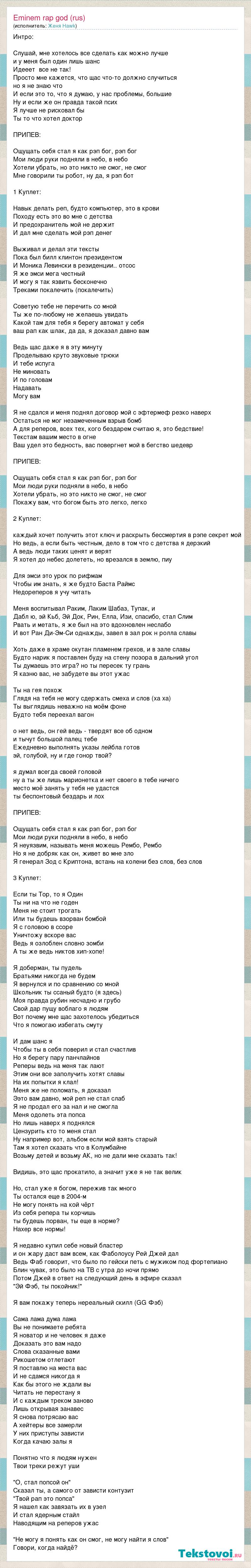 Интро: Слушай, мне хотелось все сделать как можно лучше и у меня был один лишь шанс Идееет все не так! Просто мне кажется, что щас что-то должно случиться но я не знаю что И если это то, что я думаю, у нас проблемы, большие Ну и если же он правда такой псих Я лучше не рисковал бы Ты то что хотел доктор ПРИПЕВ: Ощущать себя стал я как рэп бог, рэп бог Мои люди руки подняли в небо, в небо Хотели убрать, но это никто не смог, не смог Мне говорили ты робот, ну да, я рэп бот 1 Куплет: Навык делать реп, будто компьютер, это в крови Походу есть это во мне с детства И предохранитель мой не держит И дал мне сделать мой рэп денег Выживал и делал эти тексты Пока был билл клинтон президентом И Моника Левински в резиденции.. отсос Я же эмси мега честный И могу я так язвить бесконечно Треками покалечить (покалечить) Советую тебе не перечить со мной Ты же по-любому не желаешь увидать Какой там для тебя я берегу автомат у себя ваш рап как шлак, да да, я доказал давно вам Ведь щас даже я в эту минуту Проделываю круто звуковые трюки И тебе испуга Не миновать И по головам Надавать Могу вам Я не сдался и меня поднял договор мой с эфтермеф резко наверх Остаться не мог незамеченным взрыв бомб А для реперов, всех тех, кого бездарем считаю я, это бедствие! Текстам вашим место в огне Ваш удел это бедность, вас повергнет мой в бегство шедевр ПРИПЕВ: Ощущать себя стал я как рэп бог, рэп бог Мои люди руки подняли в небо, в небо Хотели убрать, но это никто не смог, не смог Покажу вам, что богом быть это легко, легко 2 Куплет: каждый хочет получить этот ключ и раскрыть бессмертия в рэпе секрет мой Но ведь, а если быть честным, дело в том что с детства я дерзкий А ведь люди таких ценят и верят Я хотел до небес долететь, но врезался в землю, пиу Для эмси это урок по рифмам Чтобы им знать, я же будто Баста Раймс Недореперов я учу читать Меня воспитывал Раким, Лаким Шабаз, Тупак, и Дабл ю, эй Кьб, Эй Док, Рин, Елла, Изи, спасибо, стал Слим Рвать и метать, я же был на это вдохновлен неслабо И вот Ран Ди-Эм-Си однажды, завел в зал рок н ролла славы Хоть даже в храме окутан пламенем грехов, и в зале славы Будто нарик я поставлен буду на стену позора в дальний угол Ты думаешь это игра? но ты пересек ту грань Я казню вас, не забудете вы этот ужас Ты на гея похож Глядя на тебя не могу сдержать смеха и слов (ха ха) Ты выглядишь неважно на моём фоне Будто тебя переехал вагон о нет ведь, он гей ведь - твердят все об одном и тычут большой палец тебе Ежедневно выполнять указы лейбла готов эй, голубой, ну и где гонор твой? я думал всегда своей головой ну а ты же лишь марионетка и нет своего в тебе ничего место моё занять у тебя не удастся ты беспонтовый бездарь и лох ПРИПЕВ: Ощущать себя стал я как рэп бог, рэп бог Мои люди руки подняли в небо, в небо Я неуязвим, называть меня можешь Рембо, Рембо Но я не добряк как он, живет во мне зло Я генерал Зод с Криптона, встань на колени без слов, без слов 3 Куплет: Если ты Тор, то я Один Ты ни на что не годен Меня не стоит трогать Или ты будешь взорван бомбой Я с головою в ссоре Уничтожу вскоре вас Ведь я озлоблен словно зомби А ты же ведь никтов хип-хопе! Я доберман, ты пудель Братьями никогда не будем Я вернулся и по сравнению со мной Школьник ты ссаный будто (я здесь) Моя правда рубин несчадно и грубо Свой дар пущу воблаго я людям Вот почему мне щас захотелось убедиться Что я помогаю избегать смуту И дам ша