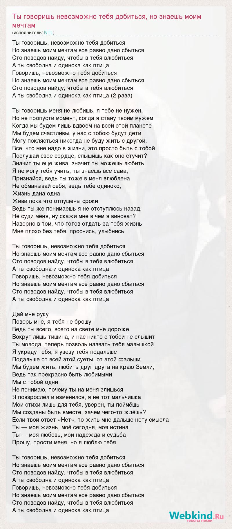 Ты говоришь, невозможно тебя добиться Но знаешь моим мечтам все равно дано сбыться Сто поводов найду, чтобы в тебя влюбиться А ты свободна и одинока как птица Говоришь, невозможно тебя добиться Но знаешь моим мечтам все равно дано сбыться Сто поводов найду, чтобы в тебя влюбиться А ты свободна и одинока как птица (2 раза) Ты говоришь меня не любишь, я тебе не нужен, Но не пропусти момент, когда я стану твоим мужем Когда мы будем лишь вдвоем на всей этой планете Мы будем счастливы, у нас с тобою будут дети Могу поклясться никогда не буду жить с другой, Все, что мне надо в жизни, это просто быть с тобой Послушай свое сердце, слышишь как оно стучит? Значит ты еще жива, значит ты можешь любить Я не могу тебя учить, ты знаешь все сама, Признайся, ведь ты тоже в меня влюблена Не обманывай себя, ведь тебе одиноко, Жизнь дана одна Живи пока что отпущены сроки Ведь ты же понимаешь я не отступлюсь назад, Не суди меня, ну скажи мне в чем я виноват? Наверно в том, что готов отдать за тебя жизнь Мне плохо без тебя, проснись, улыбнись Ты говоришь, невозможно тебя добиться Но знаешь моим мечтам все равно дано сбыться Сто поводов найду, чтобы в тебя влюбиться А ты свободна и одинока как птица Говоришь, невозможно тебя добиться Но знаешь моим мечтам все равно дано сбыться Сто поводов найду, чтобы в тебя влюбиться А ты свободна и одинока как птица Дай мне руку Поверь мне, я тебя не брошу Ведь ты всего, всего на свете мне дороже Вокруг лишь тишина, и нас никто с тобой не слышит Ты молода, теперь позволь назвать тебя малышкой Я украду тебя, я увезу тебя подальше Подальше от всей этой суеты, от этой фальши Мы будем жить, любить друг друга на краю Земли, Ведь так прекрасно быть любимыми Мы с тобой одни Не понимаю, почему ты на меня злишься Я повзрослел и изменился, я не тот мальчишка Мои стихи лишь для тебя, уверен, ты поймёшь Мы созданы быть вместе, зачем чего-то ждёшь? Если твой ответ «Нет», то жить мне дальше нету смысла Ты — моя жизнь, моё сегодня, моя истина Ты — моя любовь, мои надежда и судьба Прошу, прости меня, но я люблю тебя Ты говоришь, невозможно тебя добиться Но знаешь моим мечтам все равно дано сбыться Сто поводов найду, чтобы в тебя влюбиться А ты свободна и одинока как птица Говоришь, невозможно тебя добиться Но знаешь моим мечтам все равно дано сбыться Сто поводов найду, чтобы в тебя влюбиться А ты свободна и одинока как птица