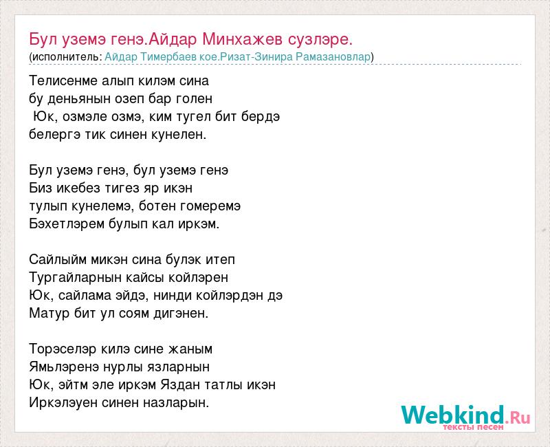 Телисенме алып килэм сина бу деньянын озеп бар голен Юк, озмэле озмэ, ким тугел бит бердэ белергэ тик синен кунелен. Бул уземэ генэ, бул уземэ генэ Биз икебез тигез яр икэн тулып кунелемэ, ботен гомеремэ Бэхетлэрем булып кал иркэм. Сайлыйм микэн сина булэк итеп Тургайларнын кайсы койлэрен Юк, сайлама эйдэ, нинди койлэрдэн дэ Матур бит ул соям дигэнен. Торэселэр килэ сине жаным Ямьлэренэ нурлы язларнын Юк, эйтм эле иркэм Яздан татлы икэн Иркэлэуен синен назларын.