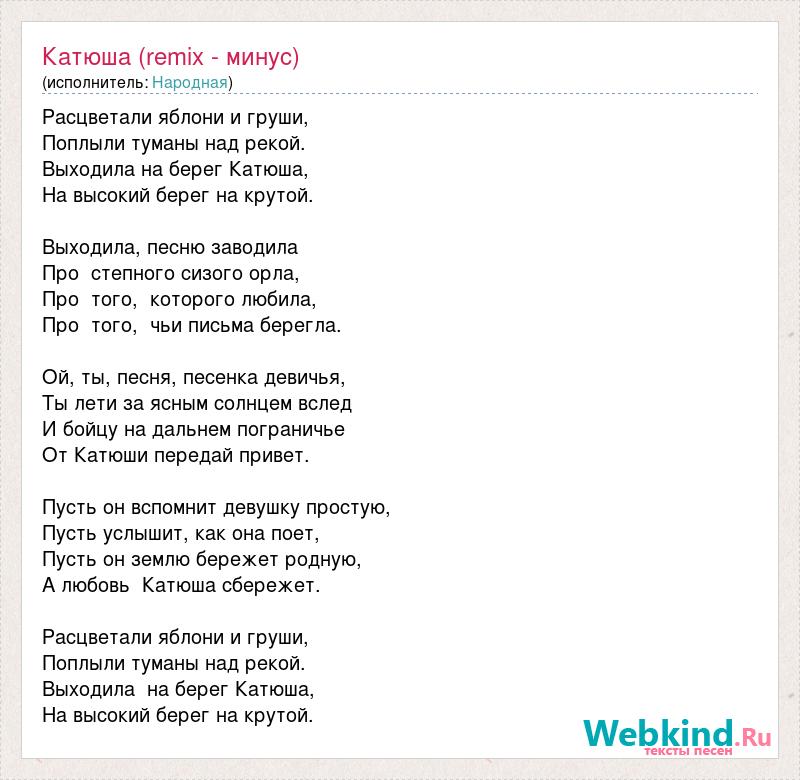 Расцветали яблони и груши, Поплыли туманы над рекой. Выходила на берег Катюша, На высокий берег на крутой. Выходила, песню заводила Про степного сизого орла, Про того, которого любила, Про того, чьи письма берегла. Ой, ты, песня, песенка девичья, Ты лети за ясным солнцем вслед И бойцу на дальнем пограничье От Катюши передай привет. Пусть он вспомнит девушку простую, Пусть услышит, как она поет, Пусть он землю бережет родную, А любовь Катюша сбережет. Расцветали яблони и груши, Поплыли туманы над рекой. Выходила на берег Катюша, На высокий берег на крутой.