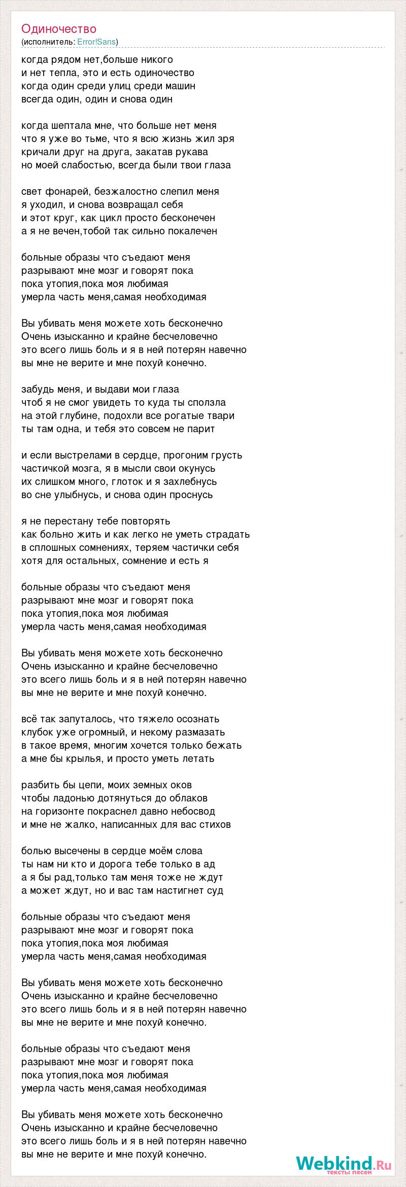 когда рядом нет,больше никого и нет тепла, это и есть одиночество когда один среди улиц среди машин всегда один, один и снова один когда шептала мне, что больше нет меня что я уже во тьме, что я всю жизнь жил зря кричали друг на друга, закатав рукава но моей слабостью, всегда были твои глаза свет фонарей, безжалостно слепил меня я уходил, и снова возвращал себя и этот круг, как цикл просто бесконечен а я не вечен,тобой так сильно покалечен больные образы что съедают меня разрывают мне мозг и говорят пока пока утопия,пока моя любимая умерла часть меня,самая необходимая Вы убивать меня можете хоть бесконечно Очень изысканно и крайне бесчеловечно это всего лишь боль и я в ней потерян навечно вы мне не верите и мне похуй конечно. забудь меня, и выдави мои глаза чтоб я не смог увидеть то куда ты сползла на этой глубине, подохли все рогатые твари ты там одна, и тебя это совсем не парит и если выстрелами в сердце, прогоним грусть частичкой мозга, я в мысли свои окунусь их слишком много, глоток и я захлебнусь во сне улыбнусь, и снова один проснусь я не перестану тебе повторять как больно жить и как легко не уметь страдать в сплошных сомнениях, теряем частички себя хотя для остальных, сомнение и есть я больные образы что съедают меня разрывают мне мозг и говорят пока пока утопия,пока моя любимая умерла часть меня,самая необходимая Вы убивать меня можете хоть бесконечно Очень изысканно и крайне бесчеловечно это всего лишь боль и я в ней потерян навечно вы мне не верите и мне похуй конечно. всё так запуталось, что тяжело осознать клубок уже огромный, и некому размазать в такое время, многим хочется только бежать а мне бы крылья, и просто уметь летать разбить бы цепи, моих земных оков чтобы ладонью дотянуться до облаков на горизонте покраснел давно небосвод и мне не жалко, написанных для вас стихов болью высечены в сердце моём слова ты нам ни кто и дорога тебе только в ад а я бы рад,только там меня тоже не ждут а может ждут, но и вас там настигнет суд больные образы что съедают меня разрывают мне мозг и говорят пока пока утопия,пока моя любимая умерла часть меня,самая необходимая Вы убивать меня можете хоть бесконечно Очень изысканно и крайне бесчеловечно это всего лишь боль и я в ней потерян навечно вы мне не верите и мне похуй конечно. больные образы что съедают меня разрывают мне мозг и говорят пока пока утопия,пока моя любимая умерла часть меня,самая необходимая Вы убивать меня можете хоть бесконечно Очень изысканно и крайне бесчеловечно это всего лишь боль и я в ней потерян навечно вы мне не верите и мне похуй конечно.