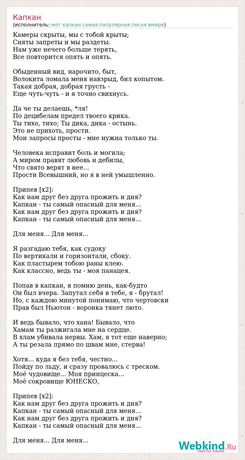 Камеры скрыты, мы с тобой крыты; Сняты запреты и мы раздеты. Нам уже нечего больше терять, Все повторится опять и опять. Обыденный вид, нарочито, быт, Волокита ломала меня навзрыд, бил копытом. Такая добрая, добрая грусть - Еще чуть-чуть - и я точно свихнусь. Да че ты делаешь, *ля! По децибелам предел твоего крика. Ты тихо, тихо; Ты дика, дика - остынь. Это не прихоть, прости. Мои запросы просты - мне нужна только ты. Человека исправит боль и могила; А миром правят любовь и дебилы, Что свято верят в нее... Прости Всевышний, но я в ней умышленно. Припев [x2]: Как нам друг без друга прожить и дня? Капкан - ты самый опасный для меня... Как нам друг без друга прожить и дня? Капкан - ты самый опасный для меня... Для меня... Для меня... Я разгадаю тебя, как судоку По вертикали и горизонтали, сбоку. Как пластырем тобою раны клею. Как классно, ведь ты - моя панацея. Попав в капкан, я помню день, как-будто Он был вчера. Запутал себя в тебе, я - брутал! Но, с каждою минутой понимаю, что чертовски Прав был Ньютон - воронка тянет люто. И ведь бывало, что хана! Бывало, что Хамам ты разжигала мне на сердце. В хлам убивала нервы. Хам, я тот еще наверно; А ты резала прямо по швам мне, стерва! Хотя... куда я без тебя, честно... Пойду по льду, и сразу провалюсь с треском. Моё чудовище... Моя принцеска... Моё сокровище ЮНЕСКО, Припев [x2]: Как нам друг без друга прожить и дня? Капкан - ты самый опасный для меня... Как нам друг без друга прожить и дня? Капкан - ты самый опасный для меня... Для меня... Для меня...